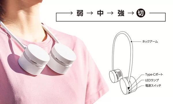 首にかけて使えるハンズフリー設計。風量は弱・中・強の3段階で調整でき、気温やシーンに合わせた快適さをキープします。