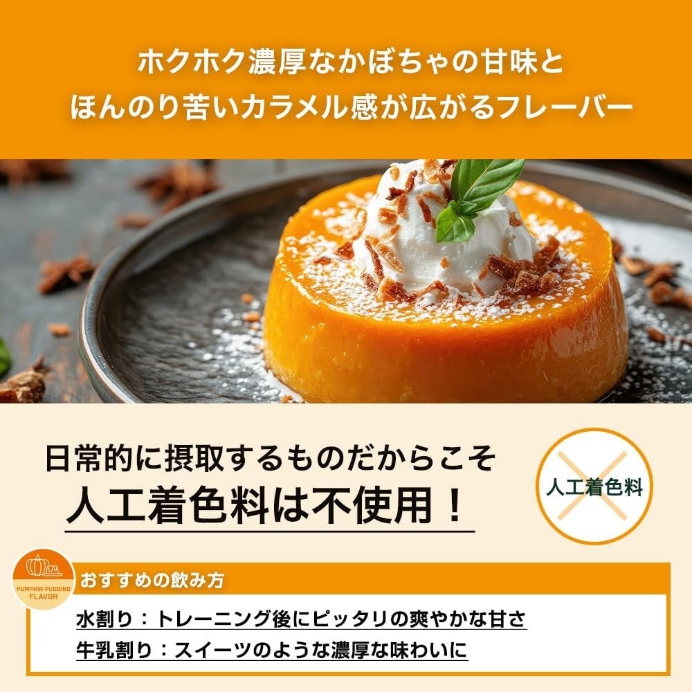 かぼちゃのほっくり感と、プリンのカラメル感を感じられる味わいのスイーツ系プロテインです。秋を感じるかぼちゃスイーツプロテインで、旬の味覚を満喫できるフレーバーです。