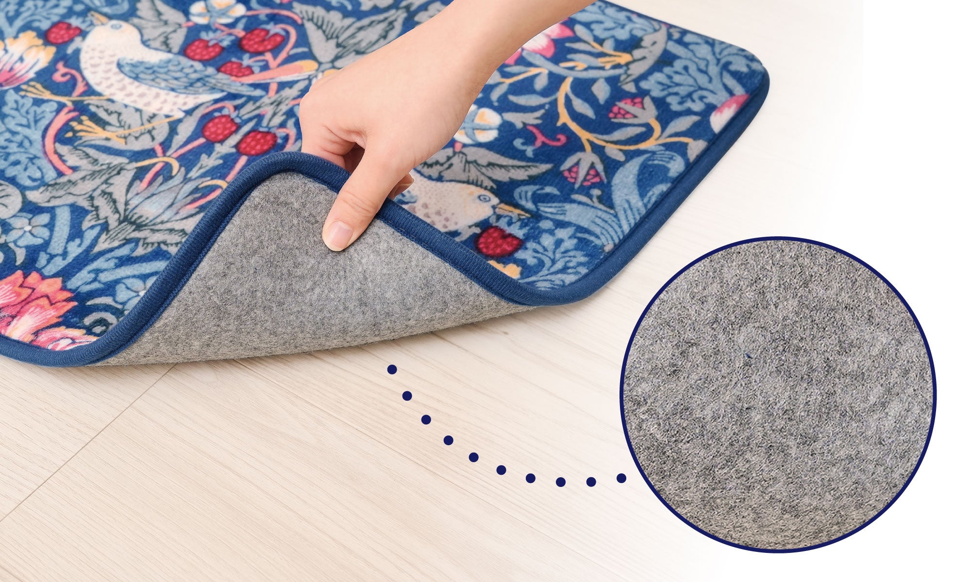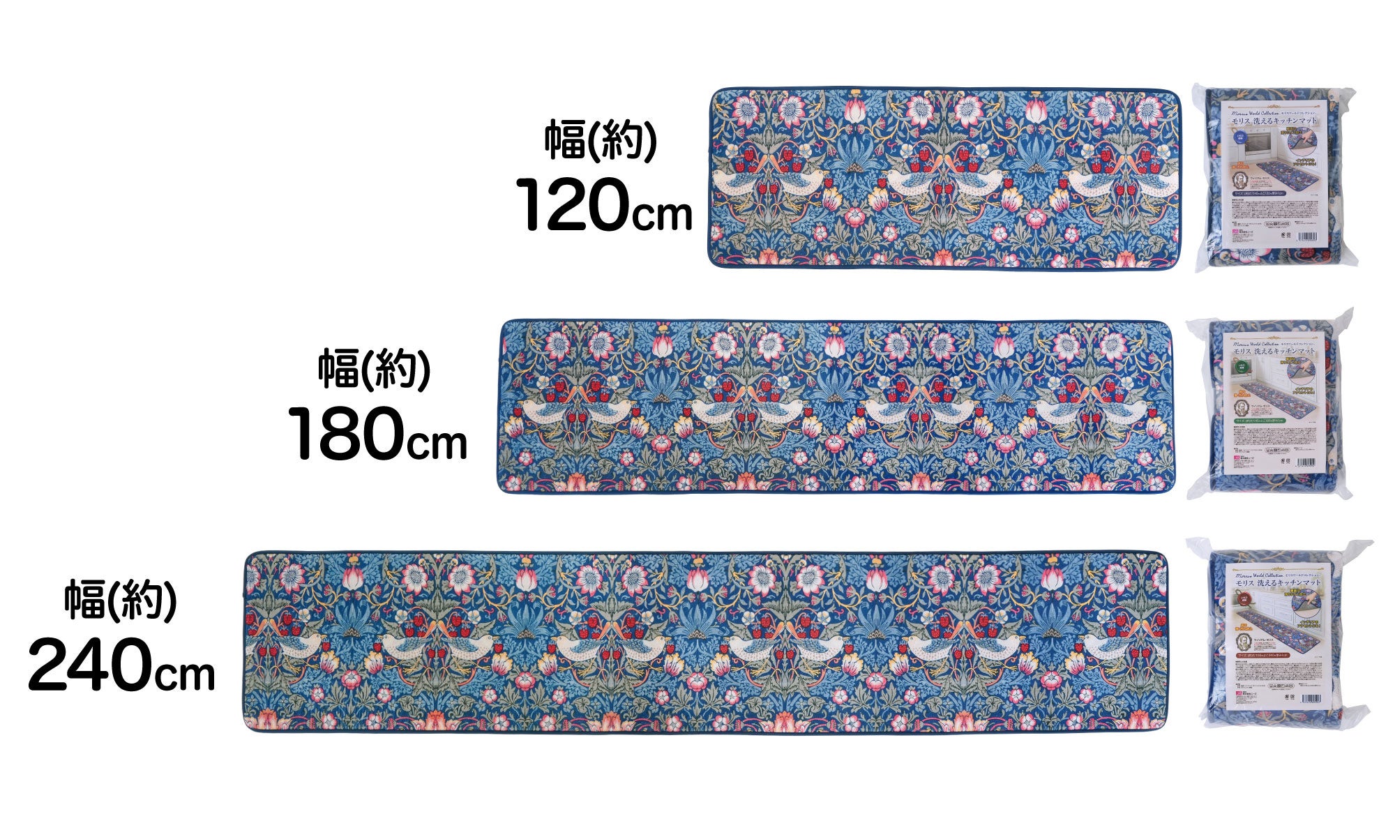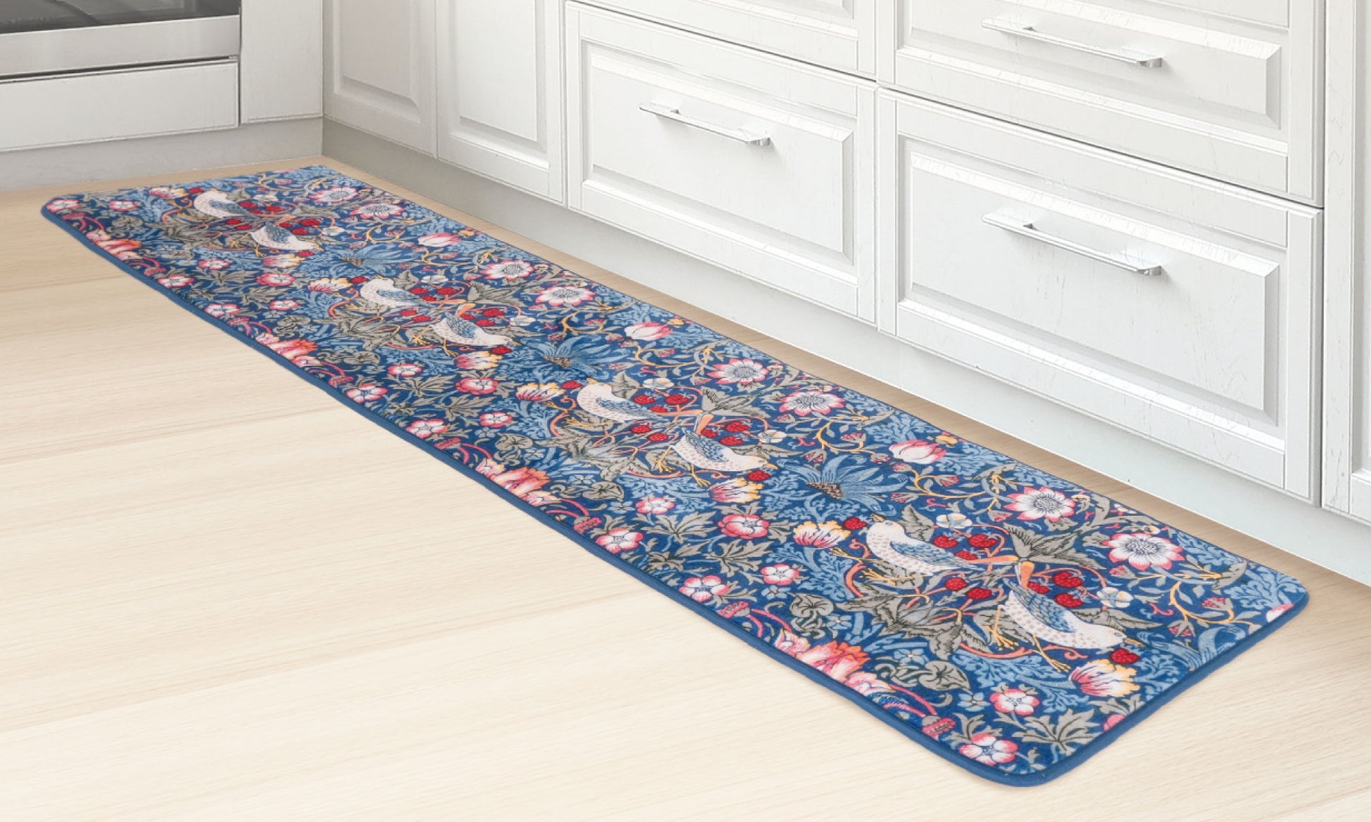 ウィリアム・モリスの「いちご泥棒」柄でキッチンを華やかに彩る♪肌ざわりの良さとお手入れのしやすさを両立した洗えるキッチンマット