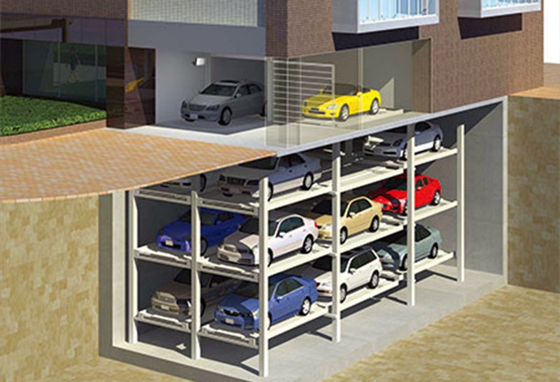 ヨコイは集合住宅やテナントビルの地下空間を有効活用できる屋内地下型の機械式駐車装置を提供しています。