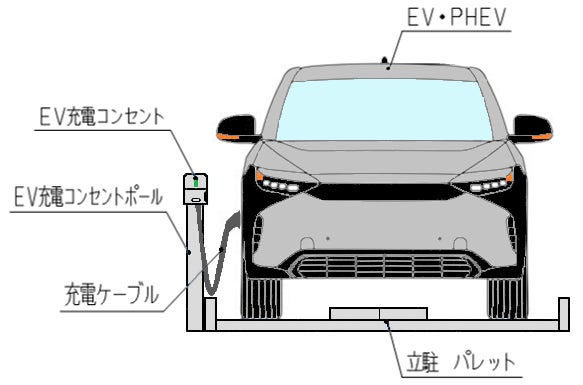機械式駐車場は、集合住宅において限られたスペースで効率的に駐車場所を確保することが可能です。一方で、機械式駐車装置内充電する場合、車体から突き出る充電プラグや充電口の蓋等も寸法に考慮する必要があるため通常サイズのパレットではスペース確保が難しく、EV充電器の設置がなかなか進んでいません。