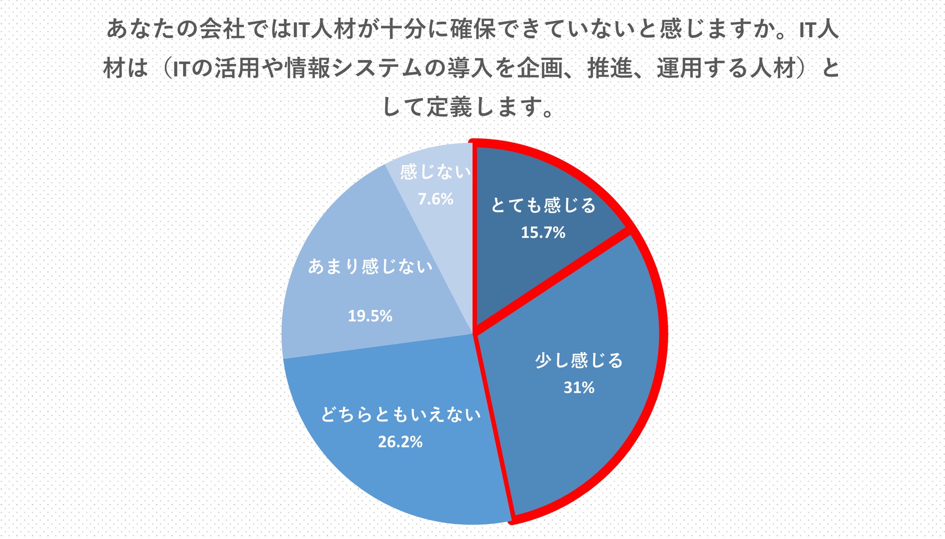 「IT人材が十分に確保できていないと感じるか」の質問に対し、46.7%が「感じる・少し感じる」と回答しました。今後のDX推進やセキュリティ対応の進展で、人材不足がさらに顕在化する可能性があります。