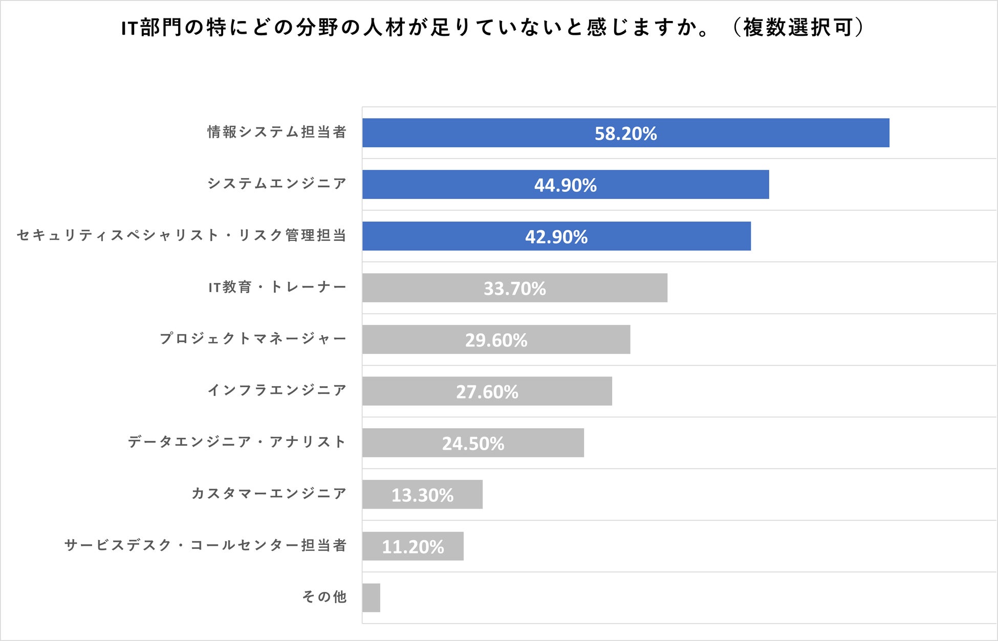 「IT部門で特に人材が不足している分野」の質問で、58.2%が「情報システム部門」と回答し、最も深刻な不足分野であることがわかりました。DX推進や社内IT基盤整備の中核を担う部門であることが背景と考えられます。