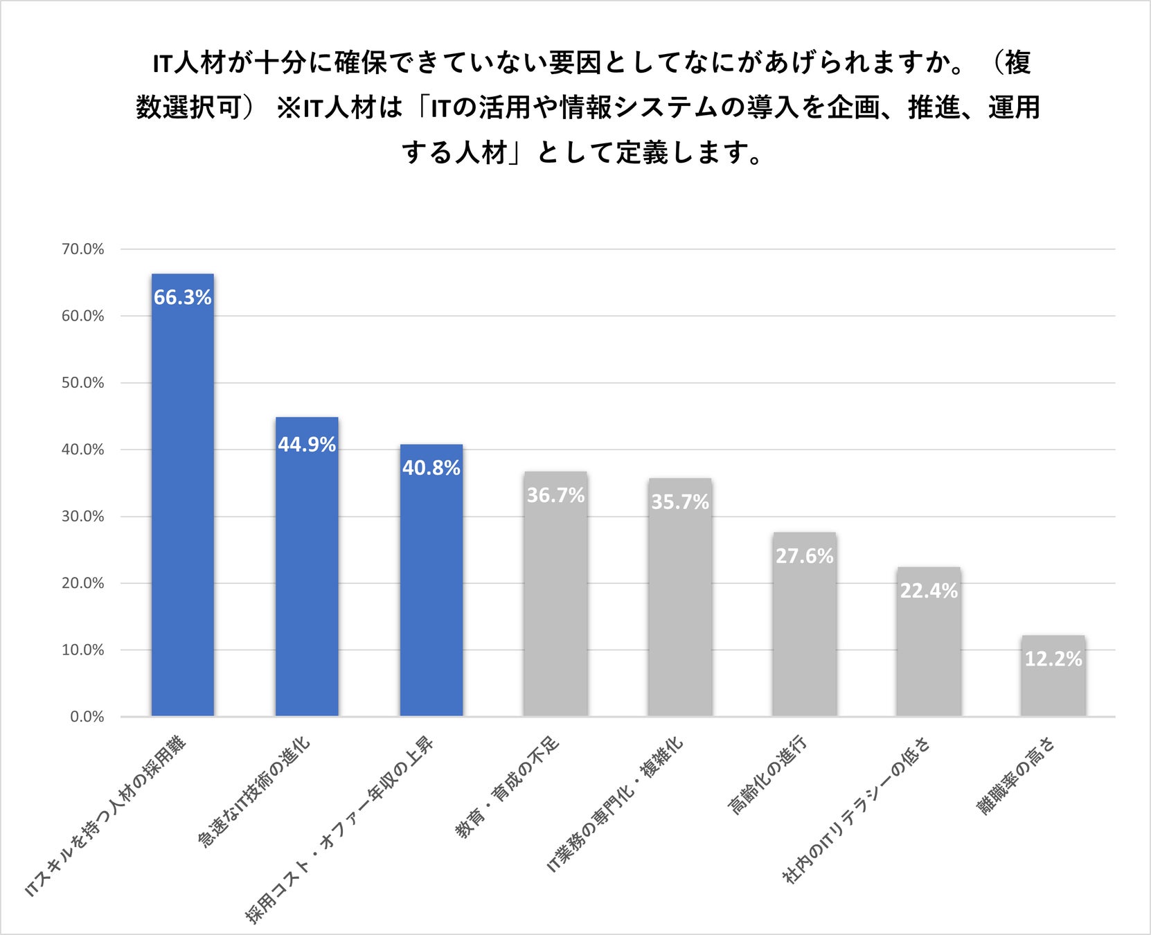 IT人材が十分に確保できていない要因」に対し、約7割(66.3%)の経営者が「ITスキルを持つ人材の採用難」を最大の原因と回答しました。これは、高度な専門スキルの需要増に供給が追いついていない現状を反映しています。