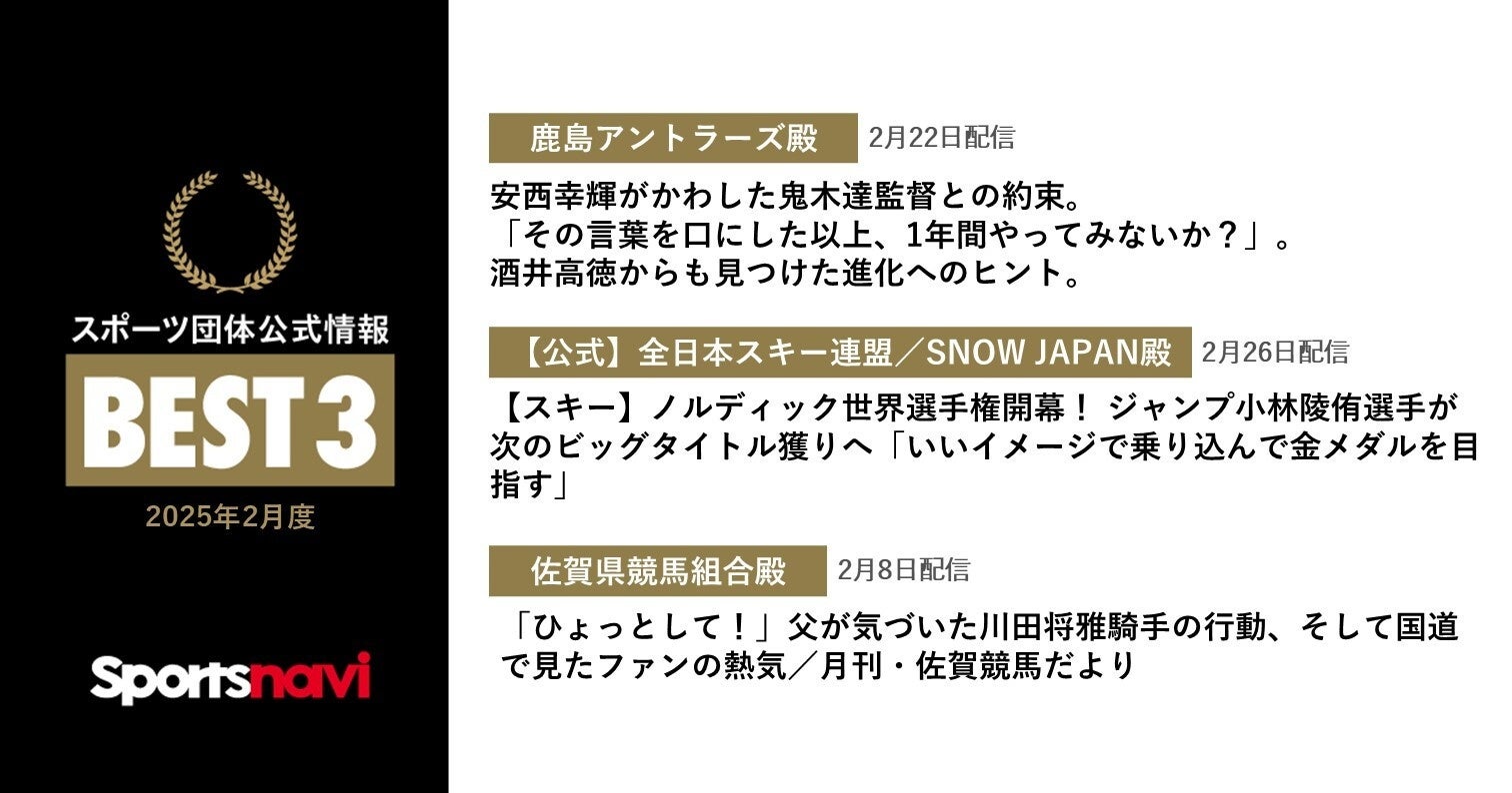 鹿島アントラーズ、全日本スキー連盟/SNOW JAPAN、佐賀県競馬組合が受賞! スポーツ団体公式情報月間ベスト3(2025年2月度)