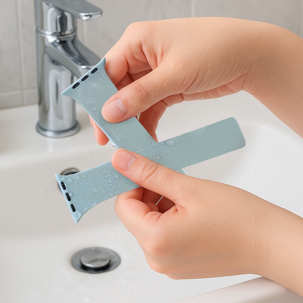 上品なシュリンクレザーの質感を表現した、マグネットで留められるシリコンバンドです。全面シリコンで着け心地がよく、着け外しも簡単にできます。