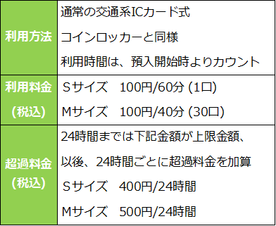 ・Sサイズが1時間ごとに100円、預入から3時間を超えた場合は最大料金400円となり、最大24時間まで400円でご利用いただけます。Mサイズが40分ごとに100円、預入から2時間40分を超えた場合は最大料金500円となり、最大24時間まで500円でご利用いただけます。
