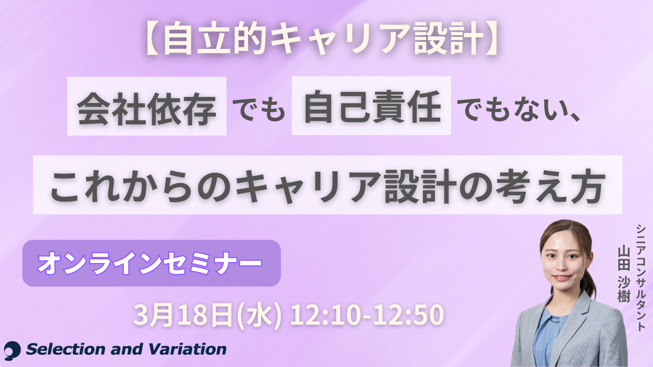 組織・人事コンサルティングファームであるセレクションアンドバリエーション株式会社(以下、当社、東京都千代田区丸の内、大阪市西区、名古屋市西区 / 代表取締役社長:平康慶浩/ URL:https://sele-vari.co.jp/ )は『【自立的キャリア設計】 会社依存でも自己責任でもない、これからのキャリア設計の考え方』セミナーを2026年3月18日(水)12:10〜12:50に開催することをお知らせいたします。