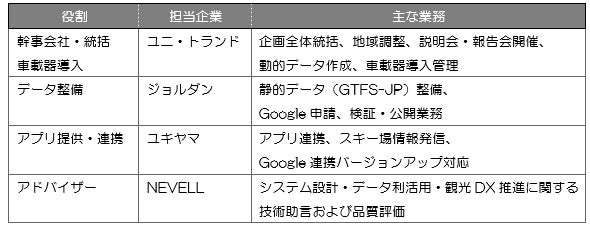 株式会社ユニ・トランドが幹事会社となり、メンバー企業として、ジョルダン株式会社、株式会社ユキヤマ、NEVELL株式会社、協力事業者として中央バス商事株式会社が参画しています。