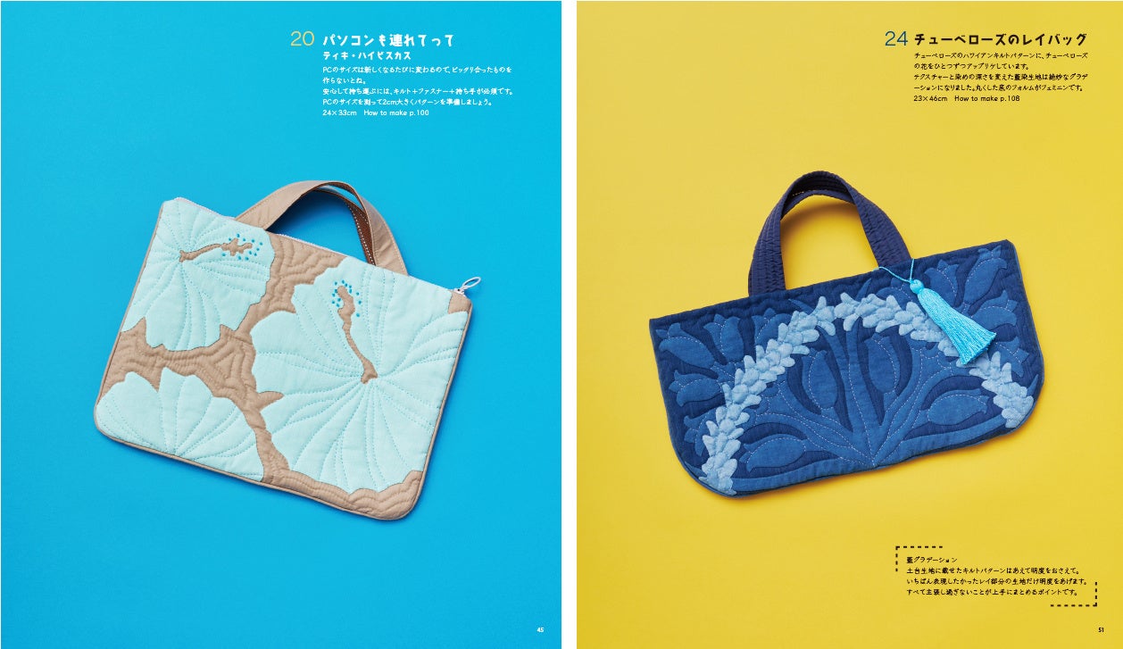 遊び心あるモチーフから、美しいハワイアンキルトのデザインまでバリエーションはさまざま。色の組み合わせの楽しさ、洗練されたデザインは著者ならでは!