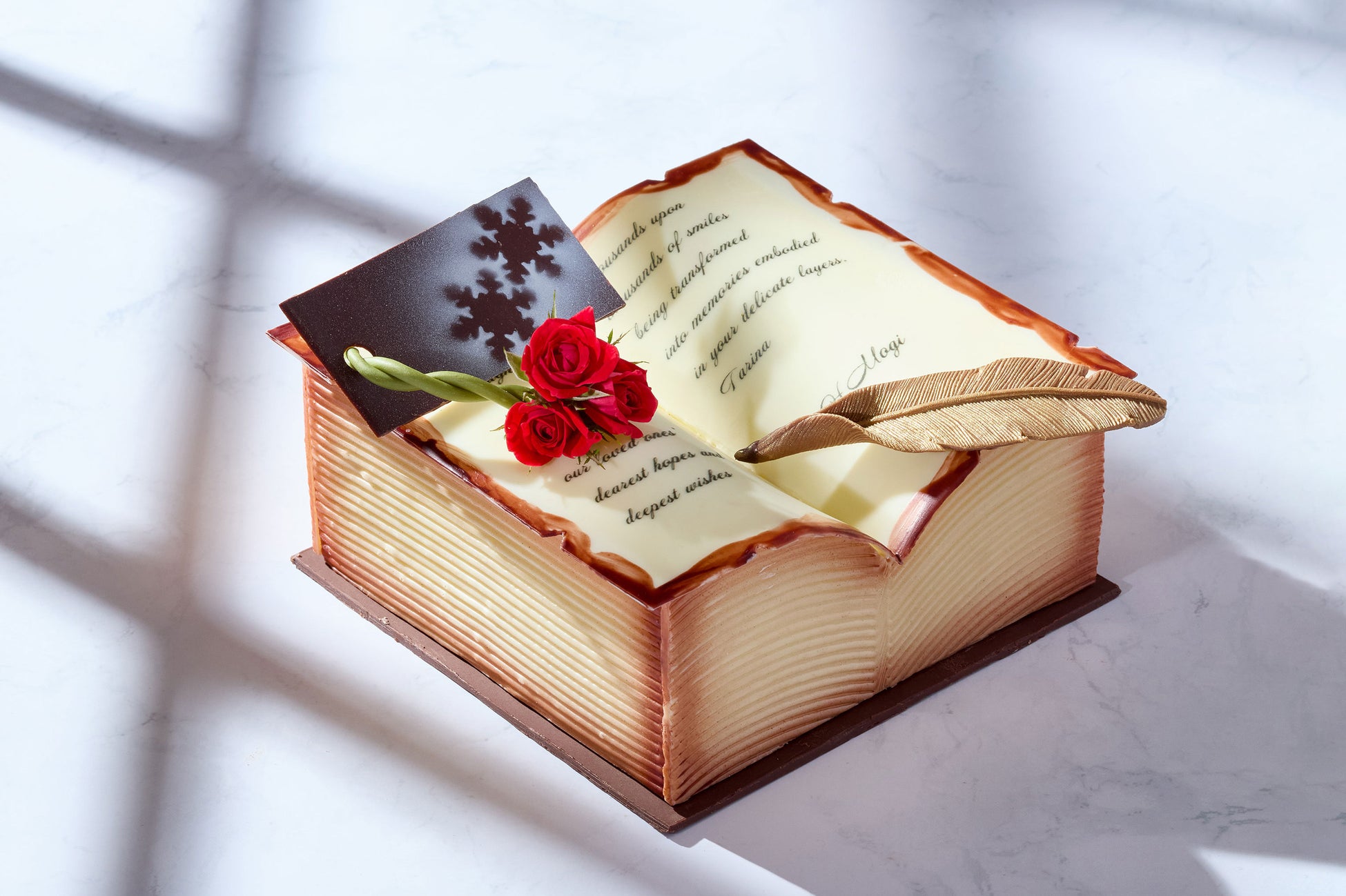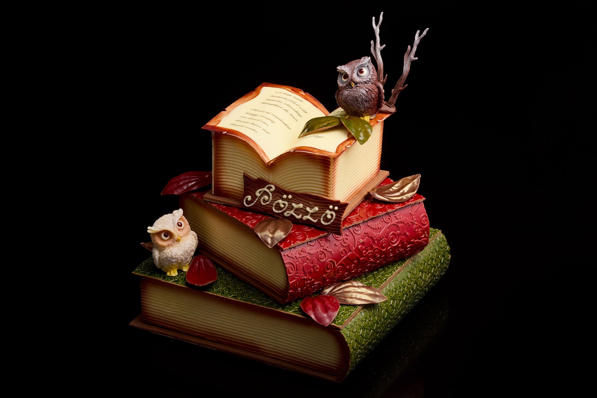 毎年人気の本型ケーキ「タリーナ」からインスピレーションを受け、3冊の物語を重ねました。幸せを運ぶふくろうの表情や本の表紙の造形、ページの重なり、1枚1枚の落ち葉の葉脈など、シェフパティシエ茂木平太が隅々までこだわった傑作です。中には7種もの異なるケーキを詰め、切り分けるごとにプレゼントを開けるかのようなサプライズをお楽しみいただけます。
