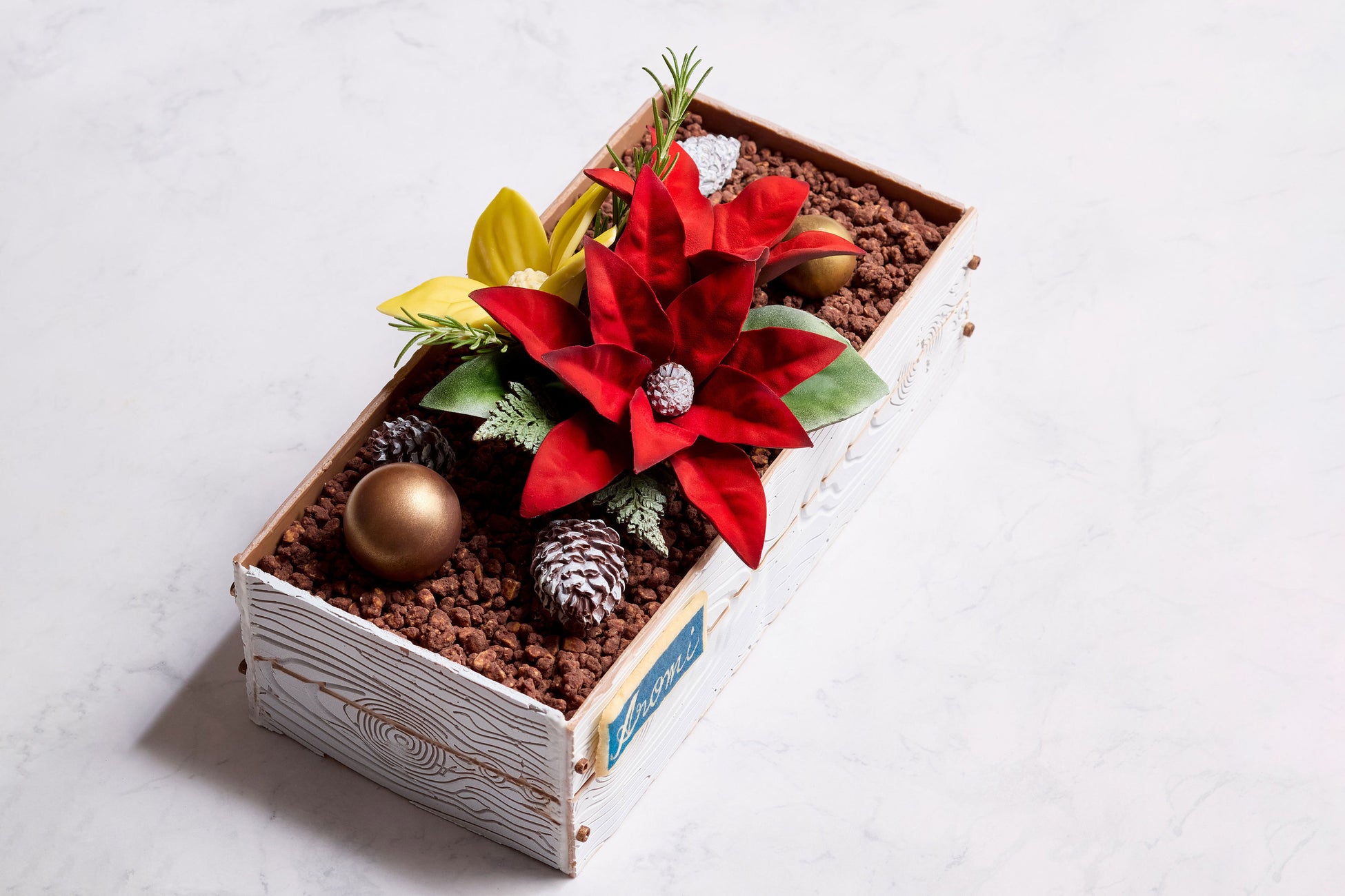 クリスマスの象徴でもあるポインセチアを模した、今年の新作ケーキです。見た目の華やかさと細部の精巧さだけでなく、フィンランド語で「香り」を意味する“AROMI”という名の通り、香り高い3種のケーキがチョコレートでできたプランターの中に隠されています。アールグレイ、トンカ豆、ローズの順に移り変わる、考え尽くされた味の変化をご堪能いただけます。