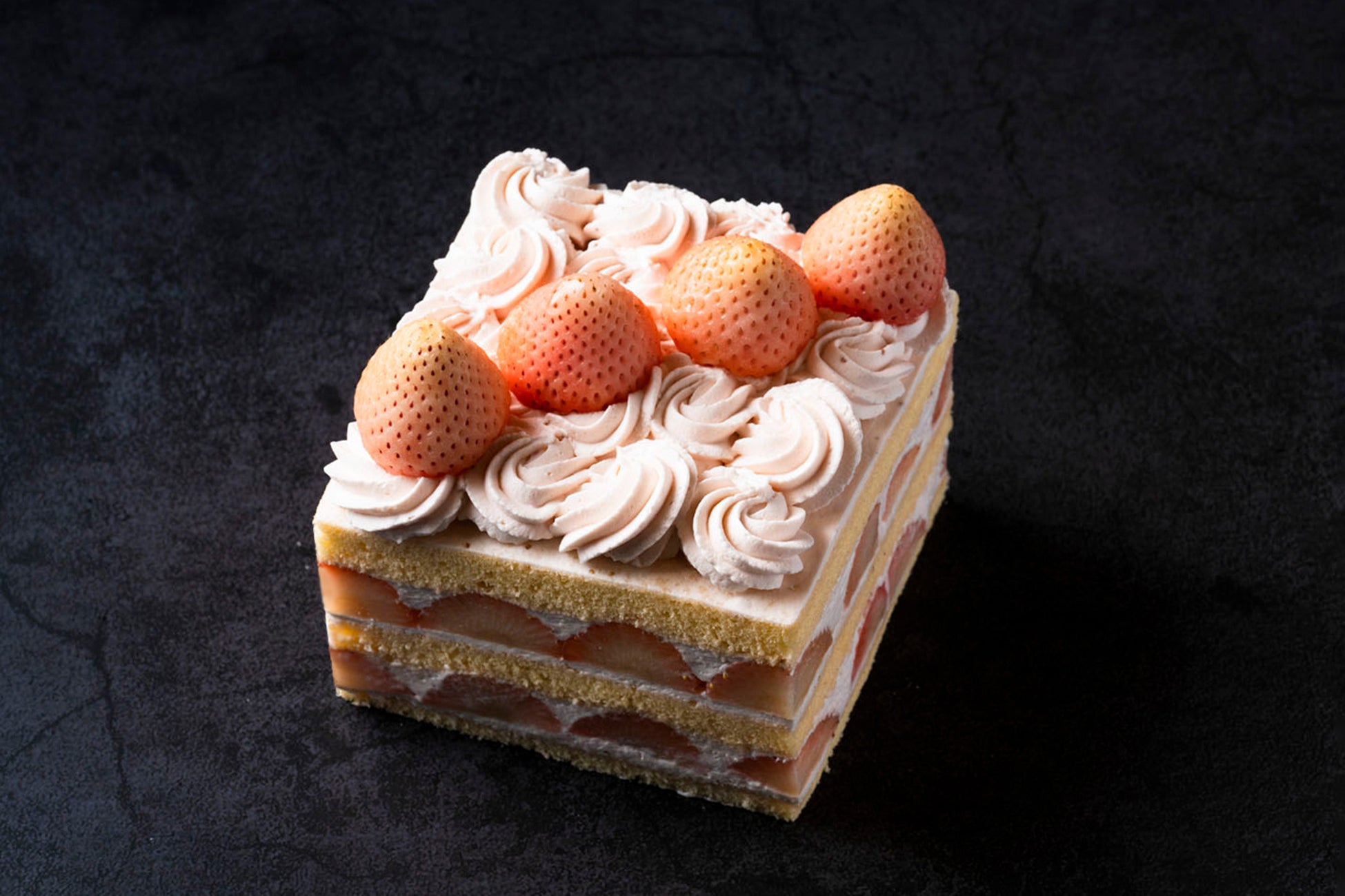 今年の新作ケーキの1つ「淡雪のショートケーキ」は茨城県鉾田市のいちご専門農家である村田農園の白いちご「淡雪」をふんだんに使用しています。土作りに徹底的にこだわり一粒一粒に愛情をこめて栽培された淡いピンクの白いちご「淡雪」を主役に、クリームには村田農園の赤いちご「とちおとめ」を使用したピューレを混ぜ込むことでほんのりピンクに仕上げた、まさに「村田農園づくし」のケーキです。