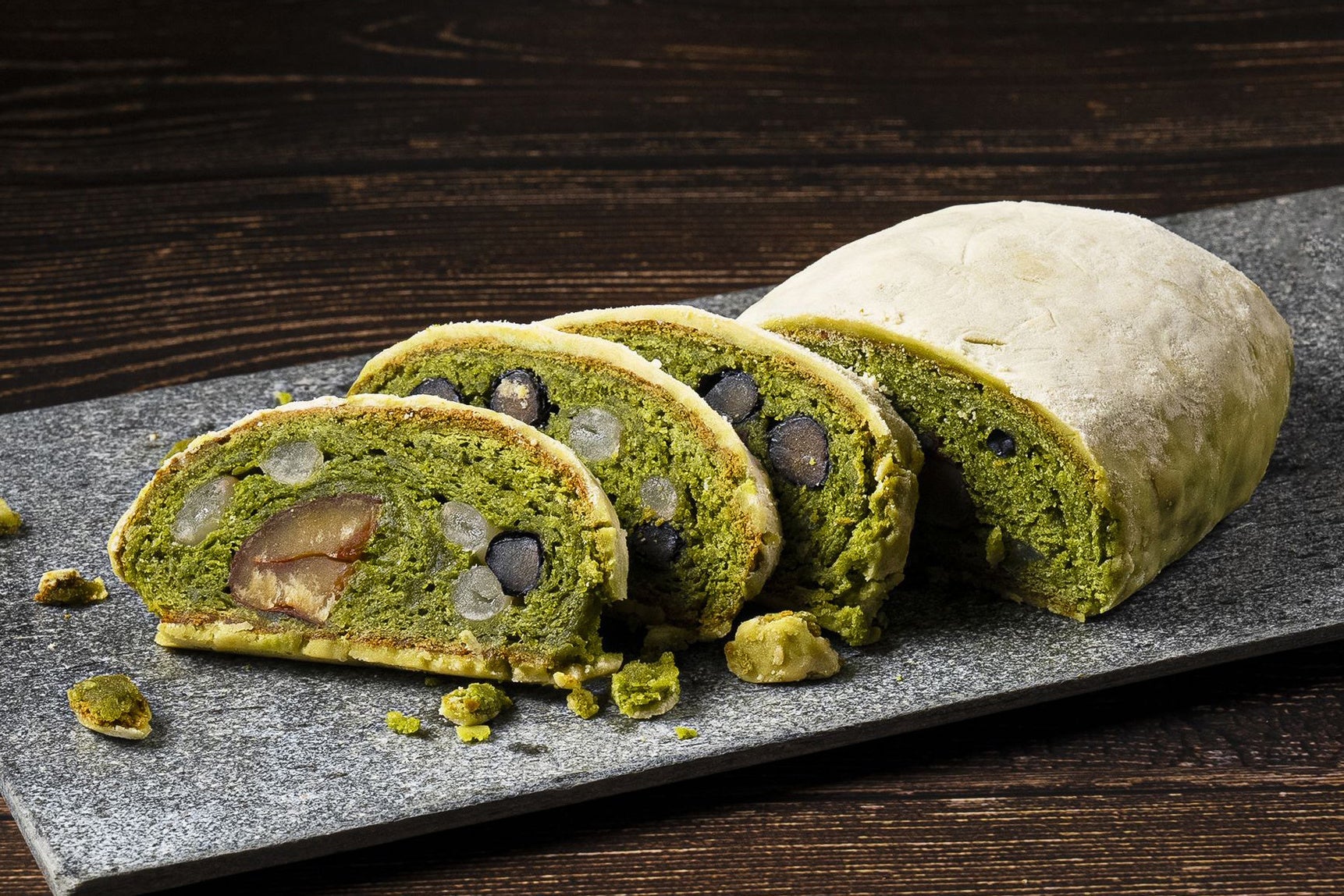 マジパンを通常のシュトーレンに比べて約3倍(※当社比)使用した濃厚な抹茶生地に、和栗の甘露煮、丹波産黒豆、手亡豆とこだわり抜いた和素材を組み合わせた逸品です。