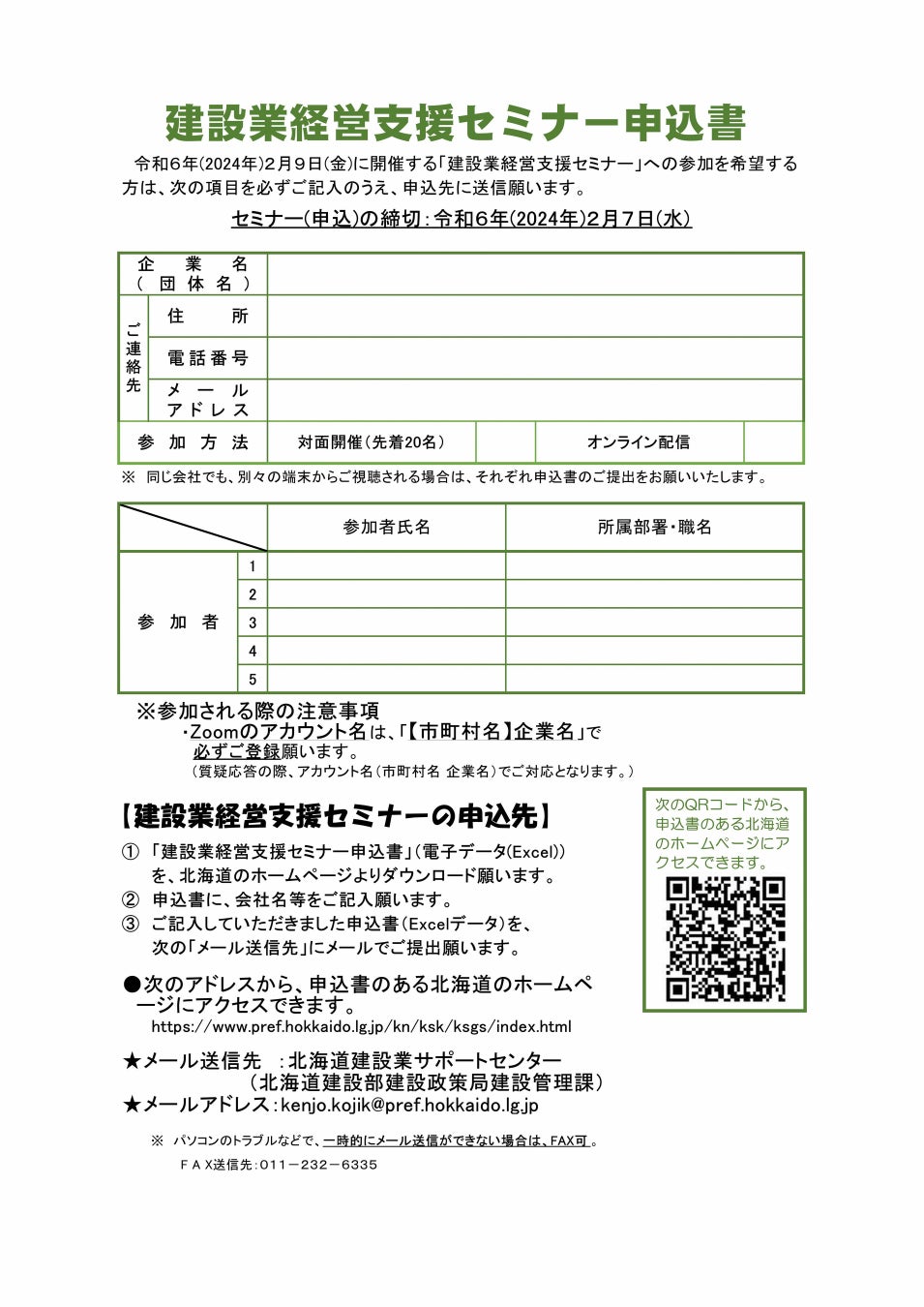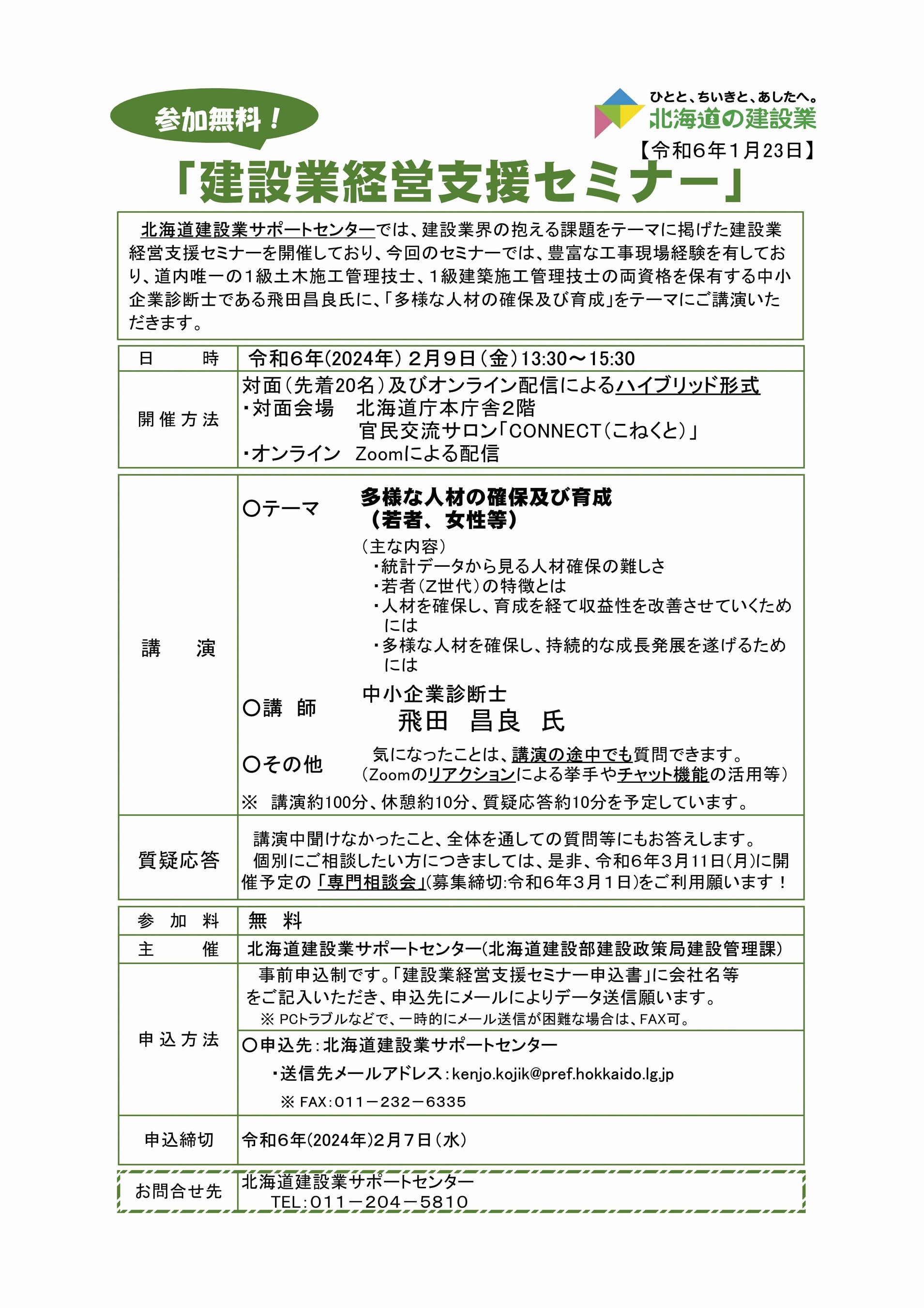 「北海道建設業サポートセンター」では、建設業界の課題をテーマに「建設業経営支援セミナー」を開催しています。