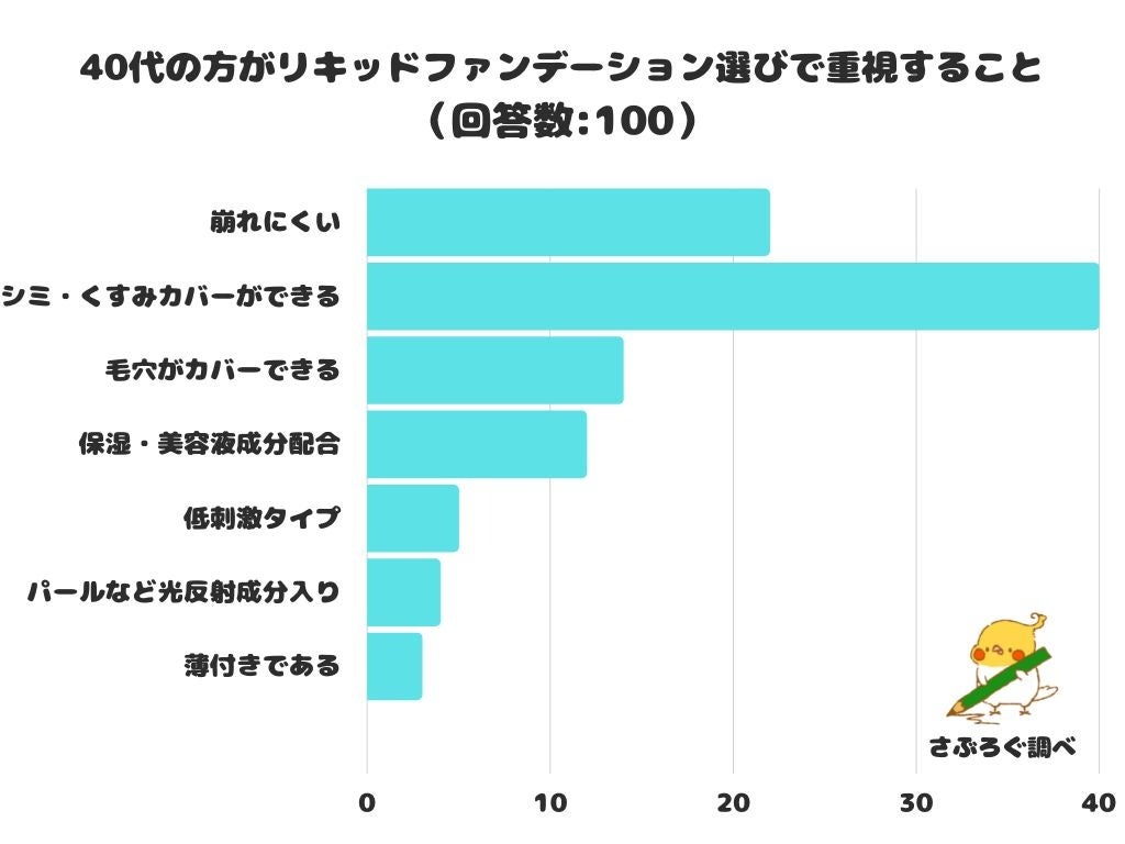 【調査レポート】40代の方がリキッドファンデーション選びで重視することは?「シミ・くすみカバーができる」が1位に!