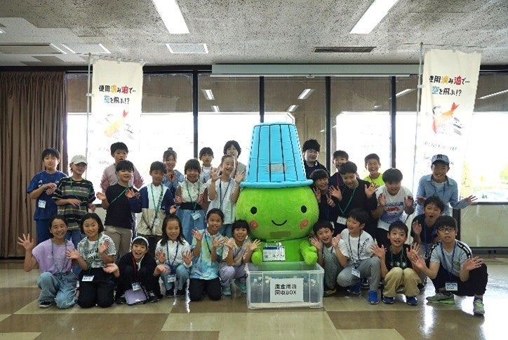 参加児童はSAFについての基本的な知識を学んだ後、廃食用油をリサイクルするプロセスとして、ペットボトルに廃食用油を集め回収ボックスに入れる工程を模擬体験しました。その後バスで製油所内を巡り、SAF製造装置や廃食用油受け入れ拠点を間近で見学。高さ約50メートルのSAF製造装置の前で記念撮影を行いました。