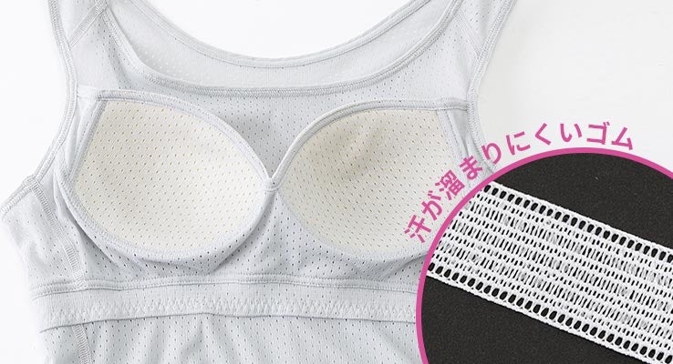 アンダーバストやウエストのゴムには自社開発のメッシュゴムを採用することで汗が溜まりにくい構造です。