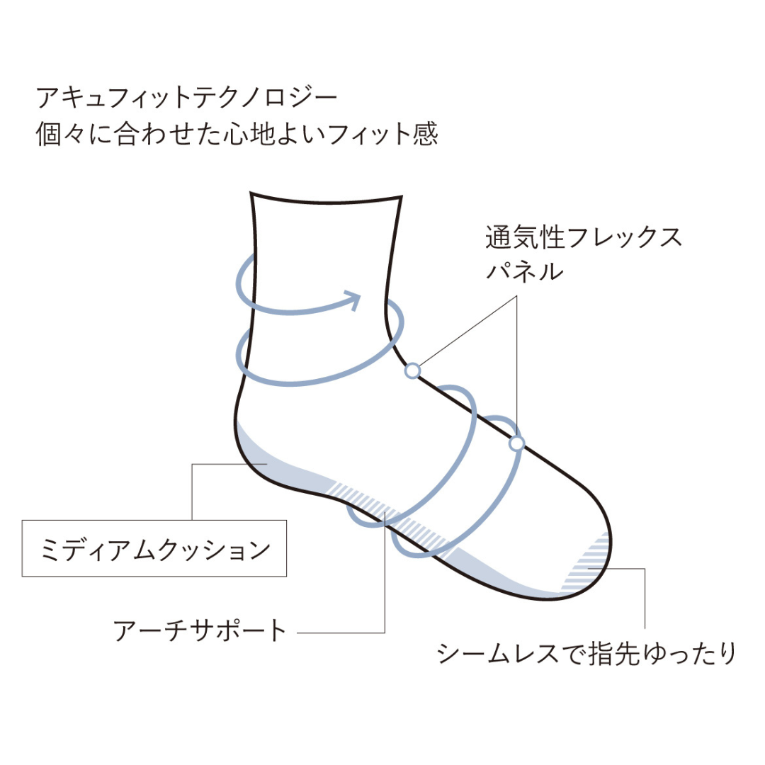 段階的な着圧設計が足全体を包み込み、筋肉の動きに配慮しながら快適なコンディションをサポート。足底筋膜や足首まわりを意識した設計とクッション性で、着地時の衝撃や足への負担にやさしく寄り添います。さらに通気性に優れた天然素材の糸がムレを抑え、運動中からその後の時間まで、さらりとした履き心地が続きます。