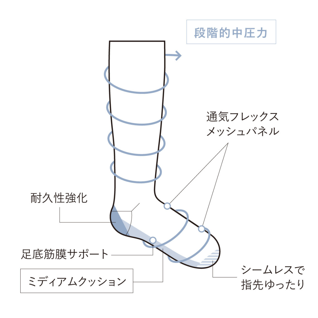 足首からふくらはぎにかけての段階的着圧、シームレスなつま先、締め付けない履き口で、朝履いた時から夜脱ぐ時まで着圧による窮屈さを感じさせません。