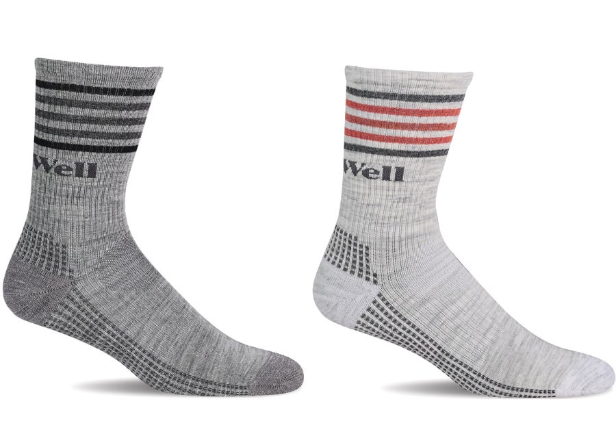 ソックウェルのロゴをさりげなくあしらった、スポーティな印象の着圧ソックス。着圧部分にはリブ編みを採用し、足に心地よくフィットする設計です。カジュアルからアクティブシーンまで、幅広いスタイリングに馴染む一足です。