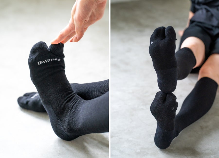 親指が分かれた足袋タイプのシリーズ。足裏だけでなく指のポケット部分にもクッションを入れることで指先の敏感な部分をカバーしました。外反母趾のケアにもおすすめです。