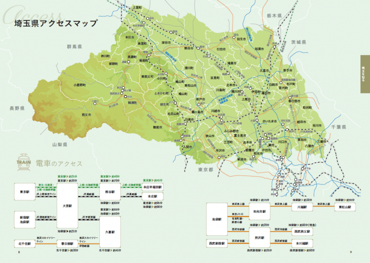 埼玉県の地図を大きく配置したアクセスマップページで、都内への交通利便性と主要駅までの所要時間が一目でわかります。