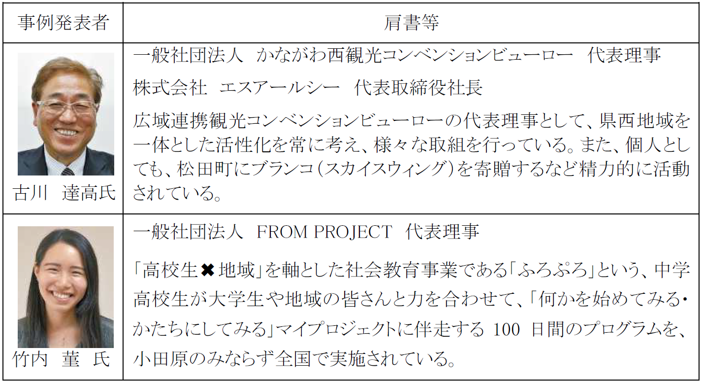 「かながわ西エリアの魅力をともに探す!~地域資源にあふれた未病の戦略的エリア~」をテーマに、県西地域 の自然や文化などに魅せられ、地域で精力的に活動している方に、活動内容や、地域への思いを語っていただきな がら、黒岩知事と、会場の皆様とで意見交換し、県西地域の魅力を探っていきます。
