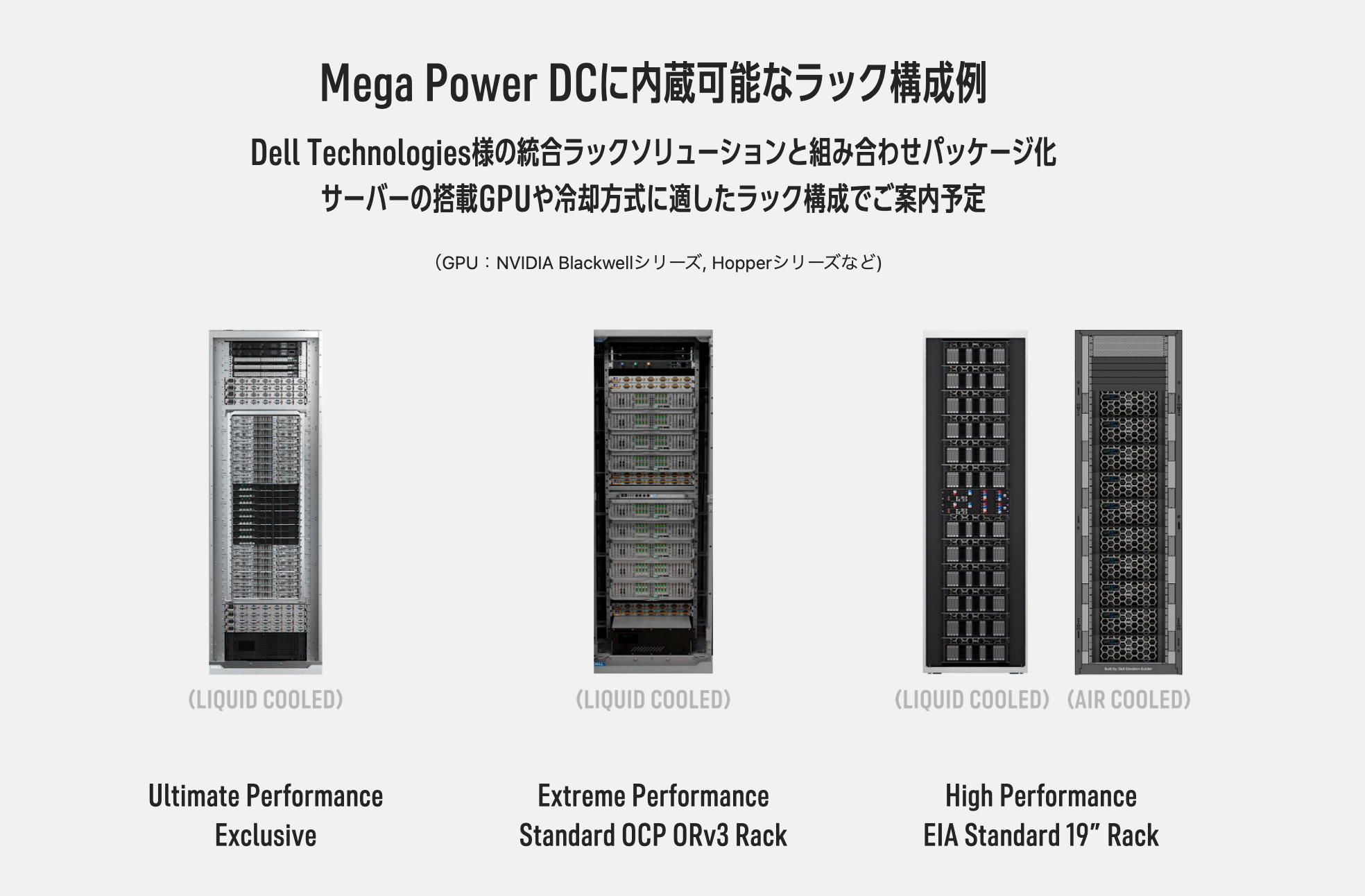また、Mega Power DCに内蔵可能なラック構成例として、デル・テクノロジーズの統合ラックソリューションと組み合わせたパッケージを紹介し、搭載GPUや冷却方式に応じた最適なラック構成を案内予定であることについても説明しました。