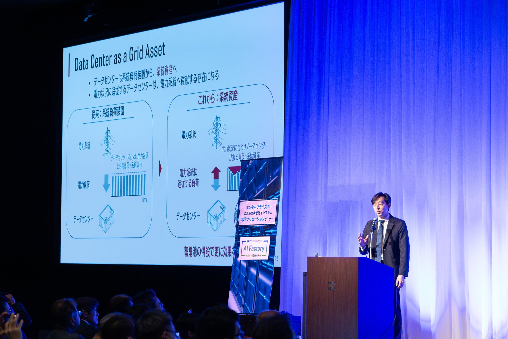 講演では「ワット×ビットの実現 ―蓄電池で拓く、データセンターの未来―」と題し、系統用蓄電システムで培った知見をもとに、電力と情報通信の融合「ワット×ビット」のビジョン、量産型コンテナデータセンター「Mega Power DC」、そして蓄電システムを前提とした新たなデータセンター事業モデルについてお話ししました。