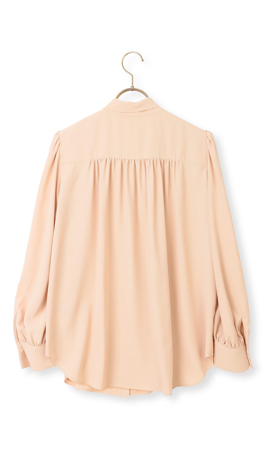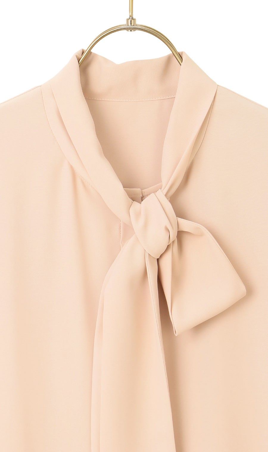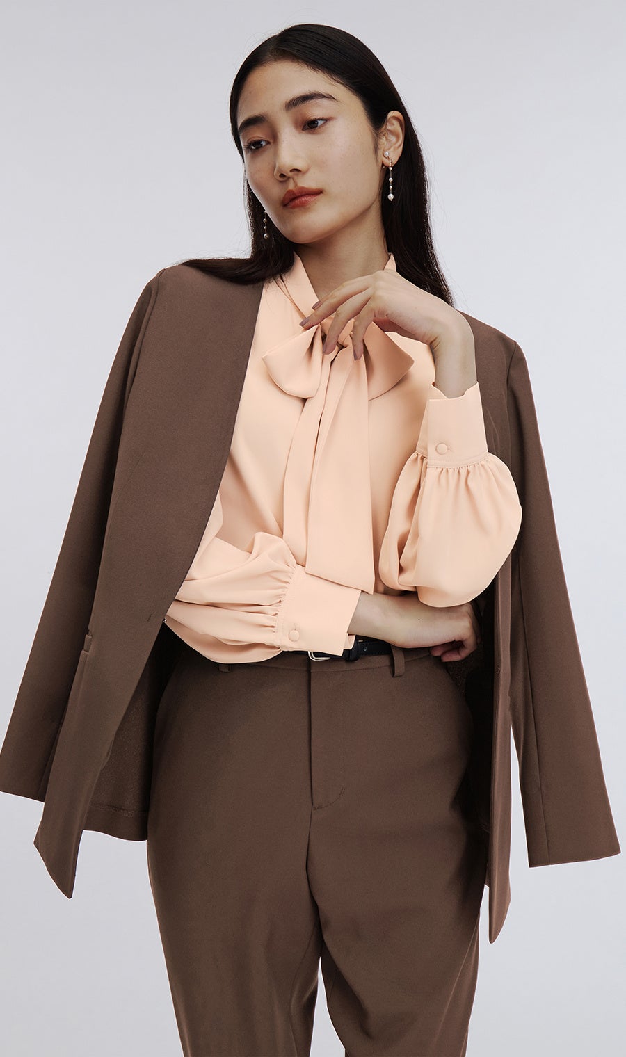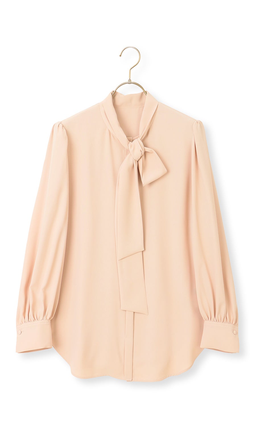 今回のソフトブラウスは「ヒルトンスーツに合う」をテーマに作製。ジャケットからの首元や胸元がきれいに見えるよう前身頃のタック幅やボタンの間隔、リボンの長さなど細部にまで拘っています。生地はとろみのある柔らかい風合いで高級感があり、程よい肉感もある素材のため裏地なしでも透けにくくなっています。カラーはベーシックで落ち着きのあるアイボリーや、肌馴染みの良いピンクベージュで大人上品を演出する淡いカラーとなっています。