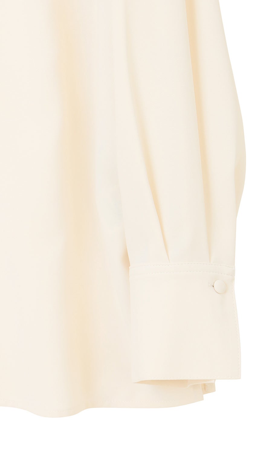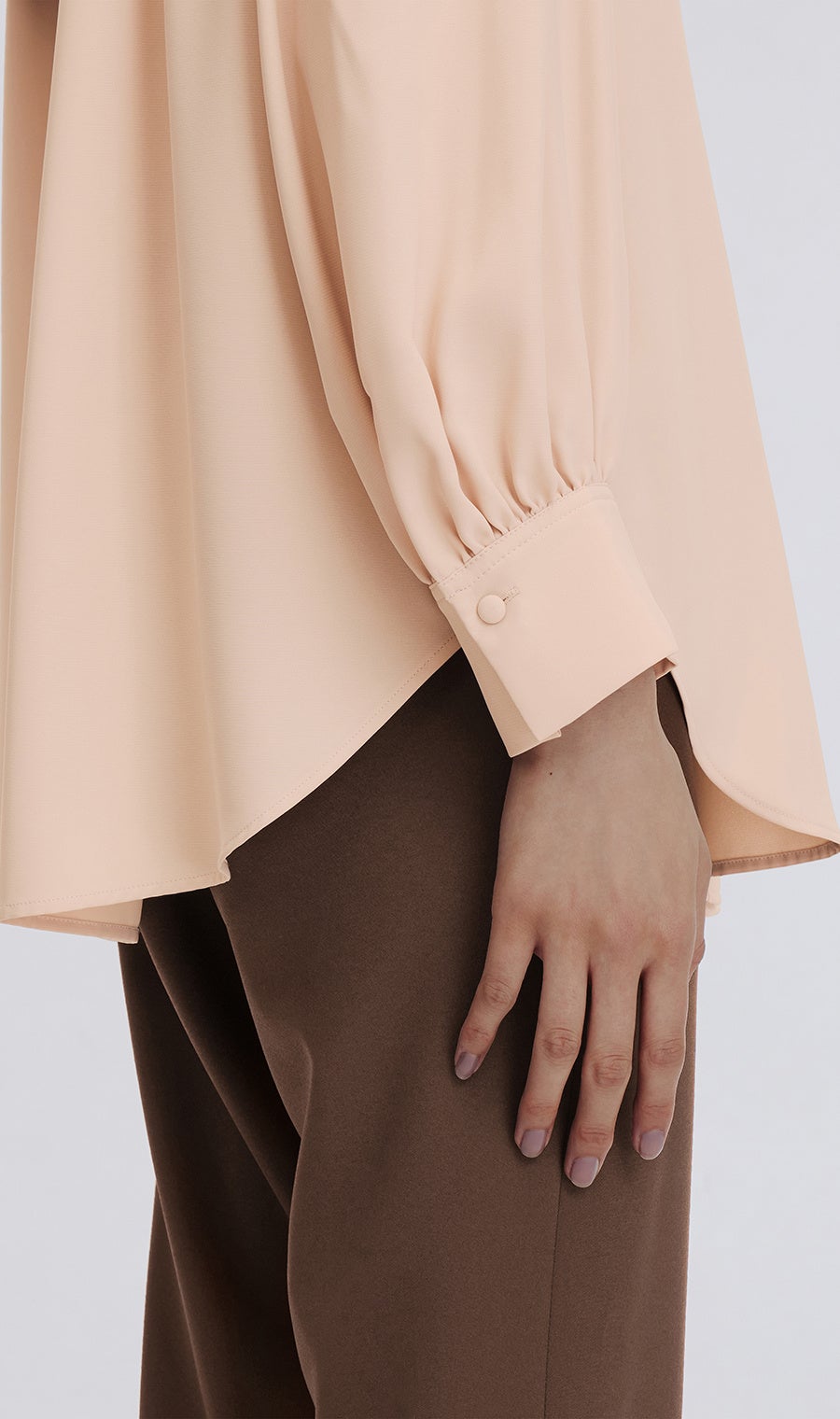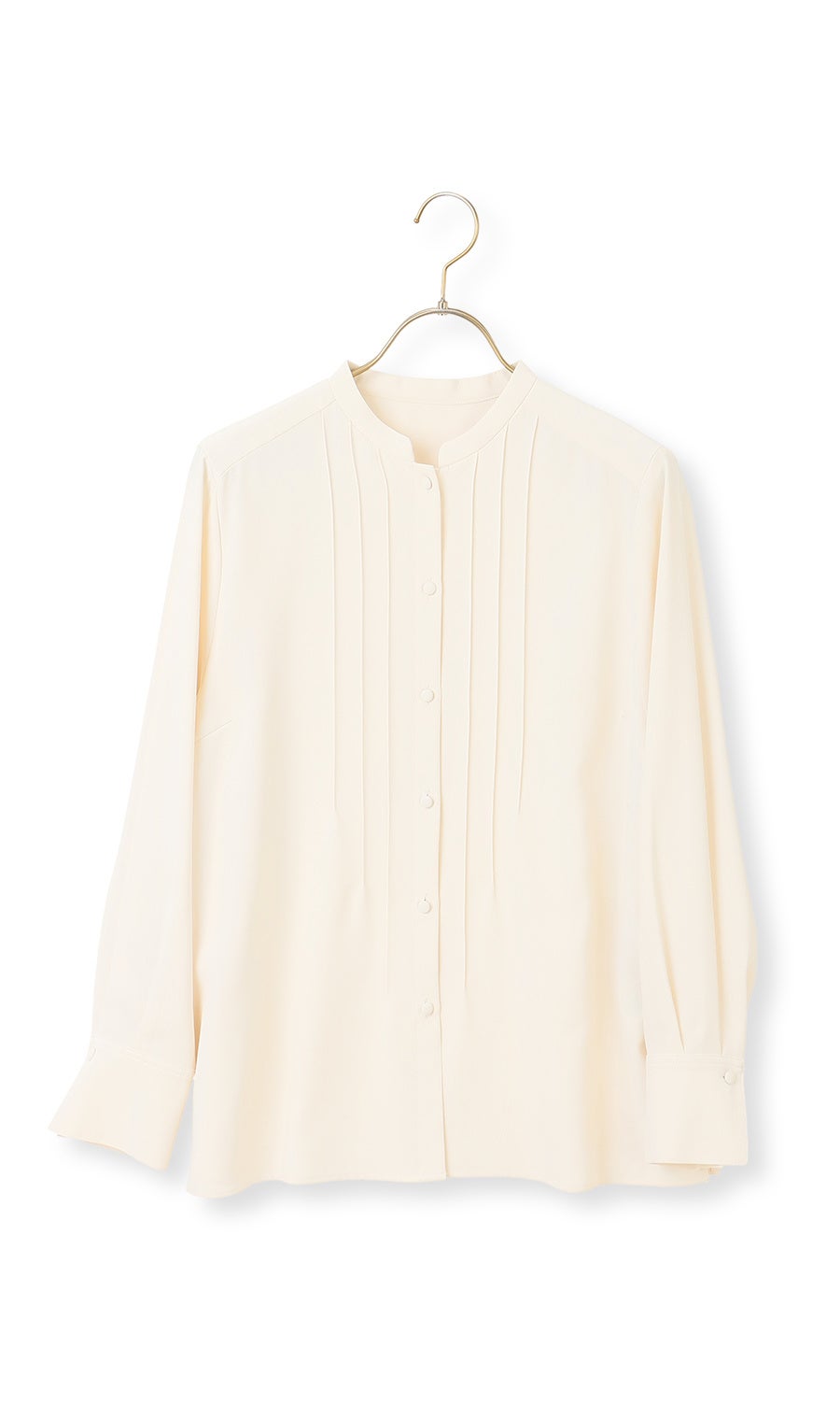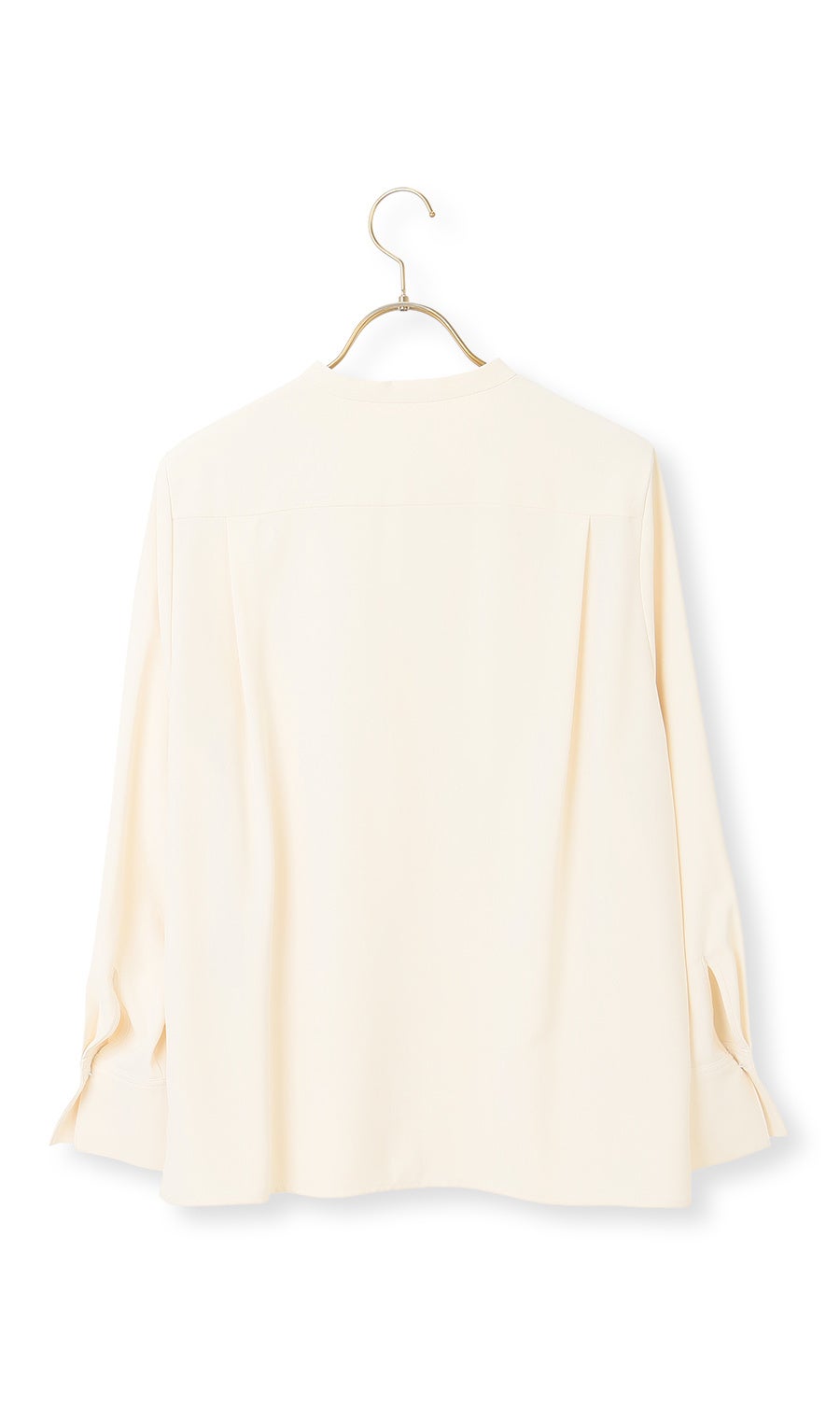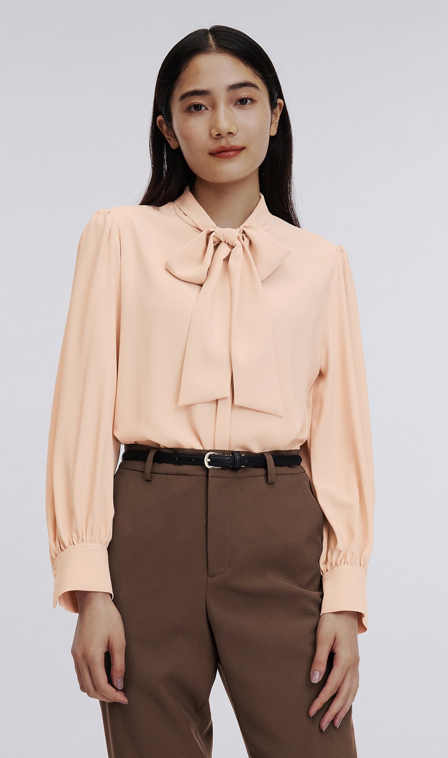 今回のソフトブラウスは「ヒルトンスーツに合う」をテーマに作製。ジャケットからの首元や胸元がきれいに見えるよう前身頃のタック幅やボタンの間隔、リボンの長さなど細部にまで拘っています。生地はとろみのある柔らかい風合いで高級感があり、程よい肉感もある素材のため裏地なしでも透けにくくなっています。カラーはベーシックで落ち着きのあるアイボリーや、肌馴染みの良いピンクベージュで大人上品を演出する淡いカラーとなっています。