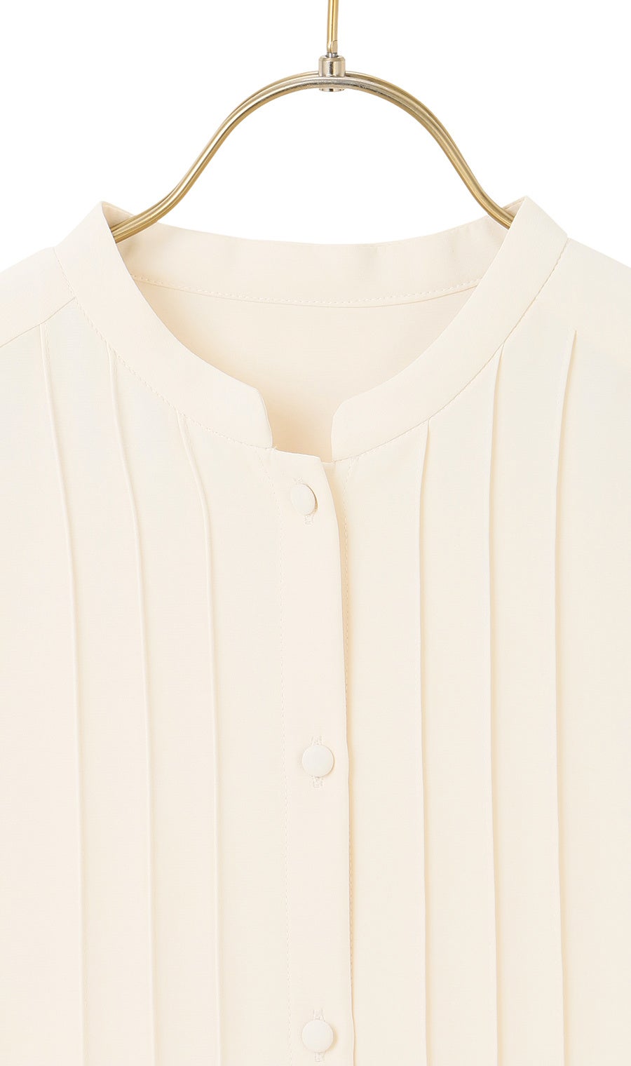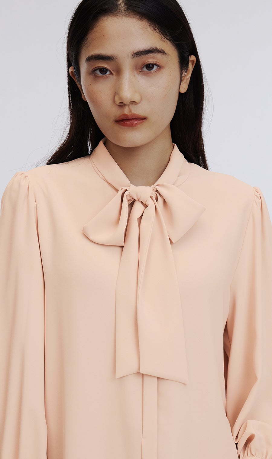 デザインはバンドカラーピンタックとボウタイの計2型を用意しました。バンドカラーは、前立てにくるみボタンを採用したことに加え、襟元は少し立たせながらもデコルテが上品に見えるよう設定。ボウタイは、ボリューム感のある首元が特徴で、リボン結びで大人可愛い印象にも、サイドで結んでエレガントな印象にもなるなど様々な雰囲気を楽しめます。会議や商談などのビジネスシーンでも安心な着回し力の高いアイテムとなっています。