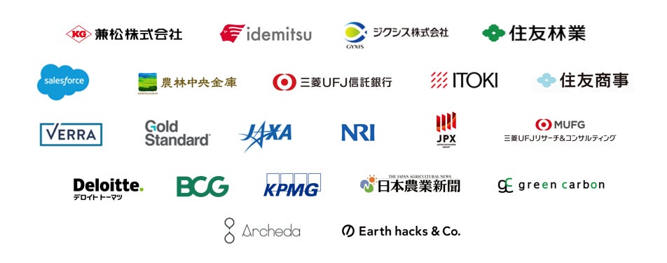 Green Carbon株式会社、国立研究開発法人宇宙航空研究開発機構(JAXA)、デロイト トーマツ ベンチャーサポート株式会社、Gold Standard、Verra、兼松株式会社、農林中央金庫、日本農業新聞、株式会社イトーキ、KPMGコンサルティング株式会社、ジクシス株式会社、住友林業株式会社、株式会社東京証券取引所、三菱UFJリサーチ&コンサルティング株式会社、株式会社野村総合研究所(NRI)、株式会社セールスフォース・ジャパン、ボストン・コンサルティング・グループ(BCG)、出光興産株式会社、住友商事株式会社、三菱UFJ信託銀行株式会社、株式会社Archeda、Earth hacks株式会社