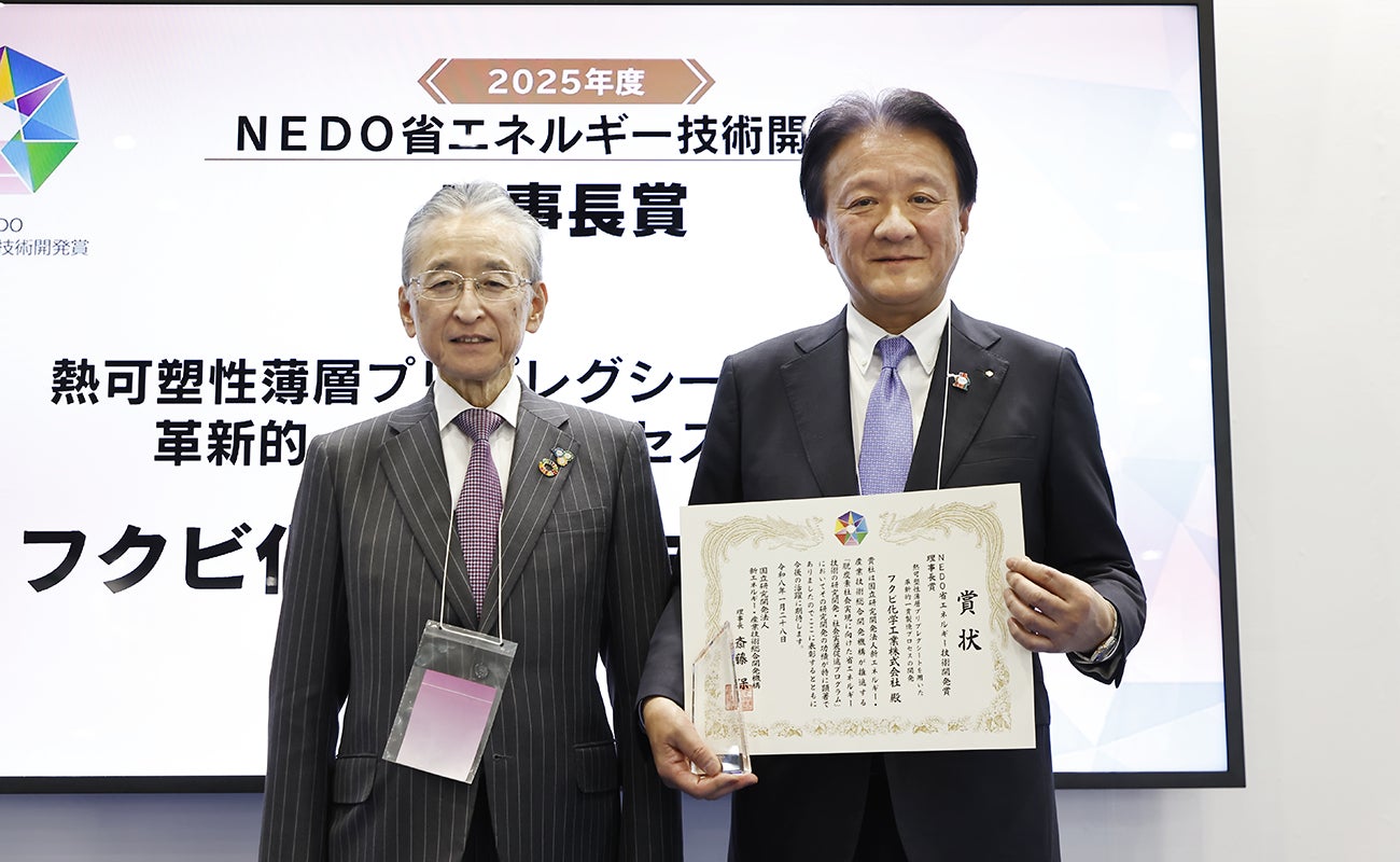 このうち最優良テーマに贈る「NEDO省エネルギー技術開発賞 理事長賞」として、「熱可塑性薄層プリプレグシートを用いた革新的一貫製造プロセスの開発」を選出し、フクビ化学工業に表彰状を授与しました。表彰式後は、受賞したフクビ化学工業によるプレゼンテーションも行われました。