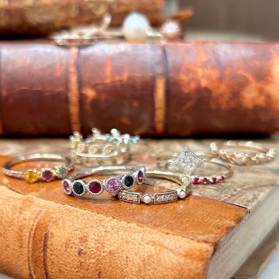 石枠の角度によっても印象が大きく変わるため、ペアシェイプを縦向き・横向きで留めたリングを重ねるなど、組み合わせによる装いの幅も広がります。