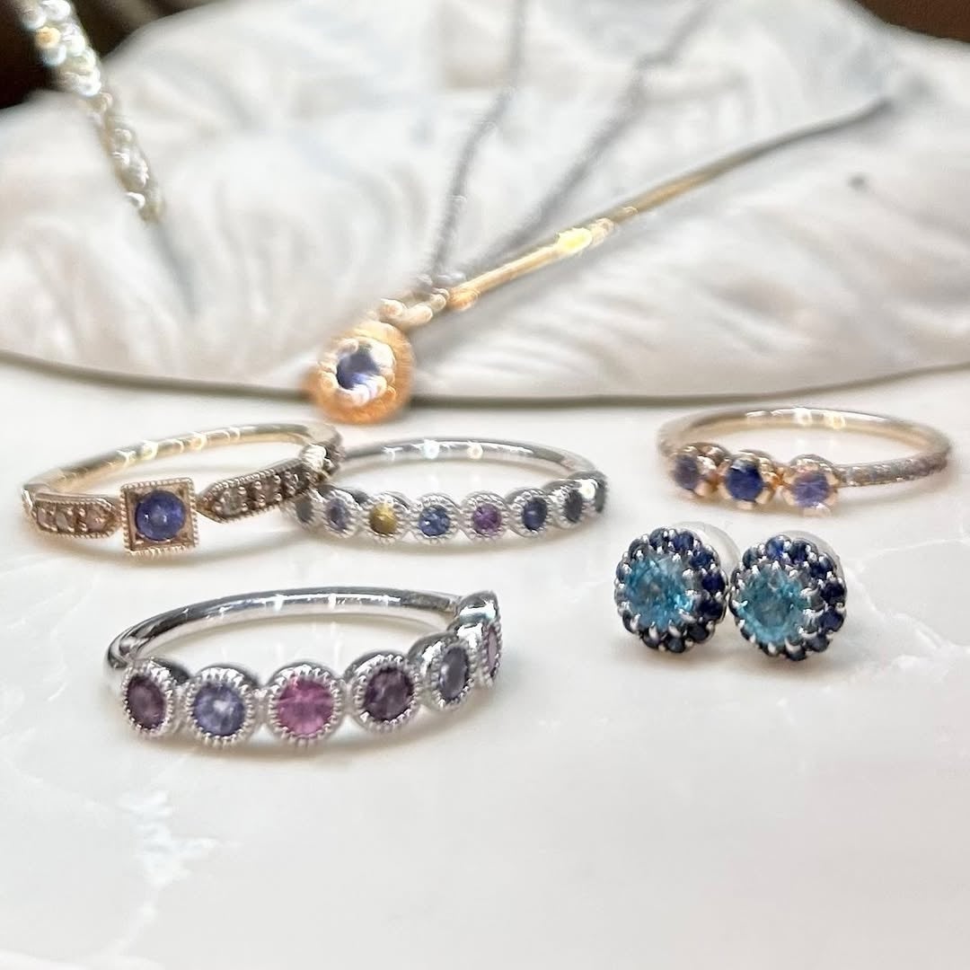 12月の誕生石である「タンザナイト」は、紫みを帯びたブルーの奥に、夜空を思わせるインクルージョンが浮かぶものなど、石ごとの個性を感じられるルースをご覧いただけます。また「サファイア」も、濃紺から淡いブルー、グレイッシュな色合いまで、幅広い表情が揃います。