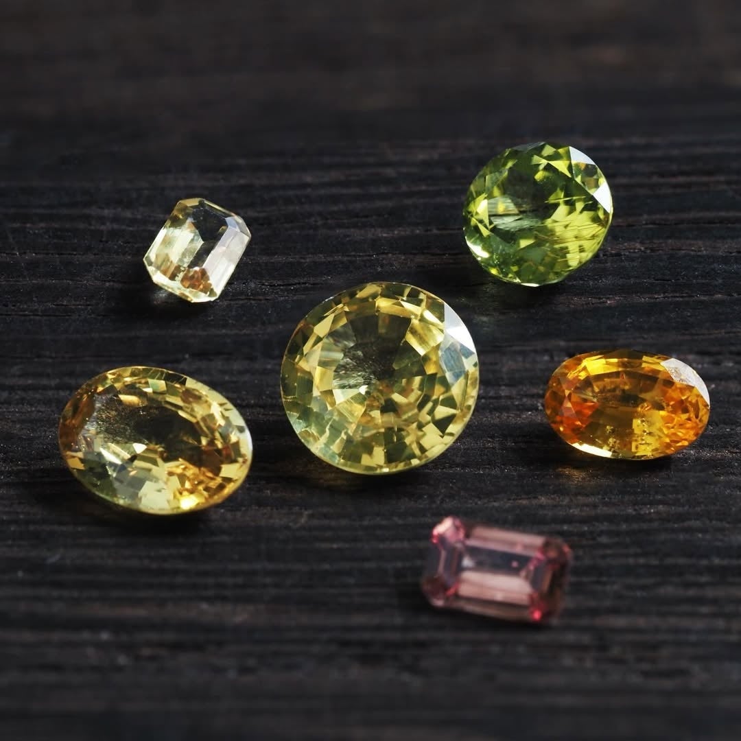 オーバル、ラウンド、マーキス、スクエアなど、形や色の濃淡もさまざま。一つひとつ異なる石の表情を見比べながら、とっておきの一本をお選びいただけます。