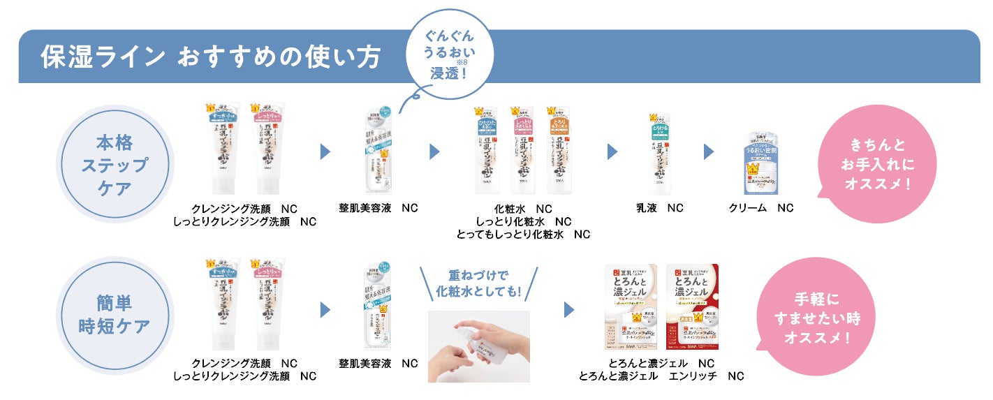 このたび今年2月に続きリニューアル第2弾として、高純度豆乳イソフラボン※1とヒト型セラミド※2を配合した導入美容液「整肌美容液 NC」を新発売いたします。また、まもなく累計販売個数1,000万個*5を突破するオールインワンタイプの「とろんと濃ジェルシリーズ」も、高純度豆乳イソフラボン※1を新配合し、保湿力と使用感をアップさせ、つめかえ用とともにリニューアル発売いたします。