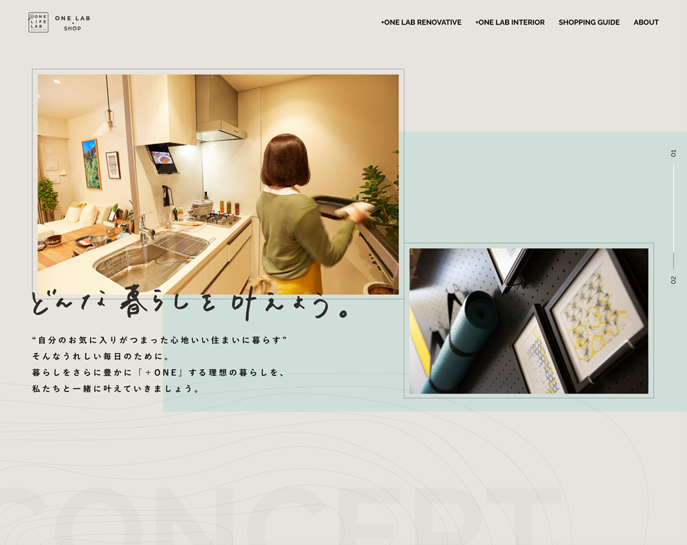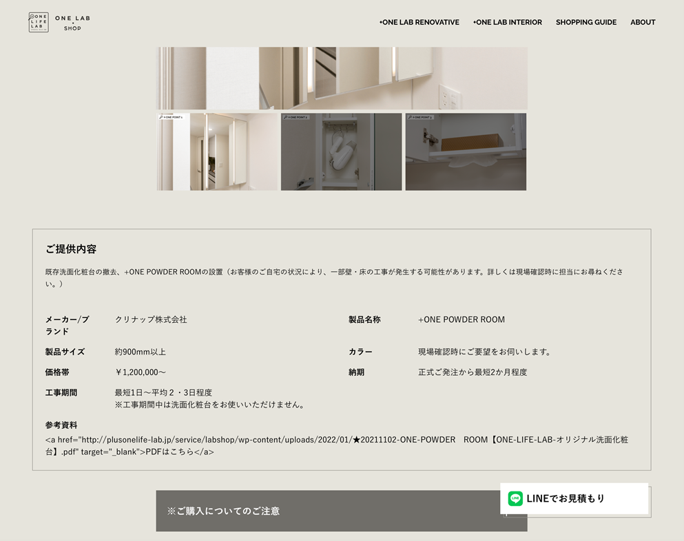 「ONE LAB・SHOP」で購入できる商品には2つのカテゴリーがあります。ひとつは、「+ONE LAB RENOVATIVE」というリフォームプランで、既存設備の撤去や設置工事が必要な商品です。もうひとつは、「+ONE LAB INTERIOR」という家具セットや小物アイテムで、配送された商品を自由にコーディネートできる商品です。