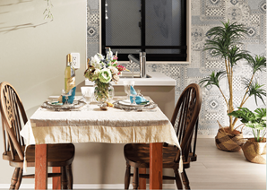ブルーを基調としたオリエンタルデザイン柄の壁紙など異国のような雰囲気にリビングダイニングを演出。