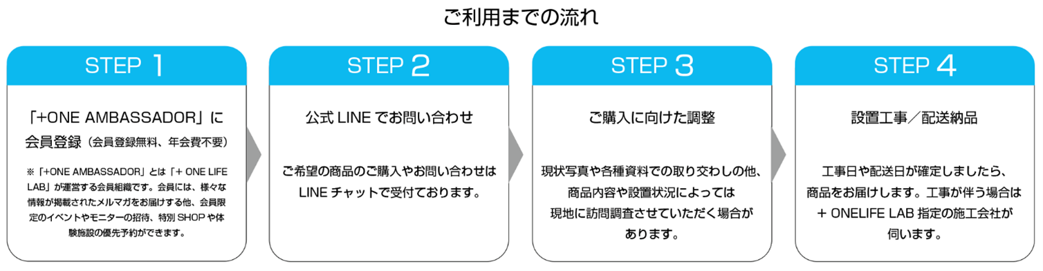 ONE LAB・SHOPの閲覧や参考図面のダウンロードには、会員登録もLINE登録も不要です。商品を公式HPで見て、検討するタイミングでワンラボが運営する「+ONE AMBASSADOR」に会員登録後、公式LINEで問い合わせができます。公式LINEでは、見積もり依頼や寸法の詳細確認、納品日の確認など、商品や工事に関する様々な問い合わせが可能です。その後、購入の意思が固まったら、LINE経由で申込書を依頼し、お客様と提携先の施工会社間で申込書・契約書の取り交わしを行っていただきます。