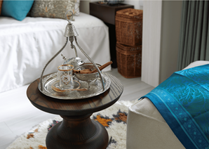 モロッコブルーの爽やかなラグ、モダンなデザインの照明やサイドテーブルなど、寝室をオリエンタルな雰囲気にコーディネート。