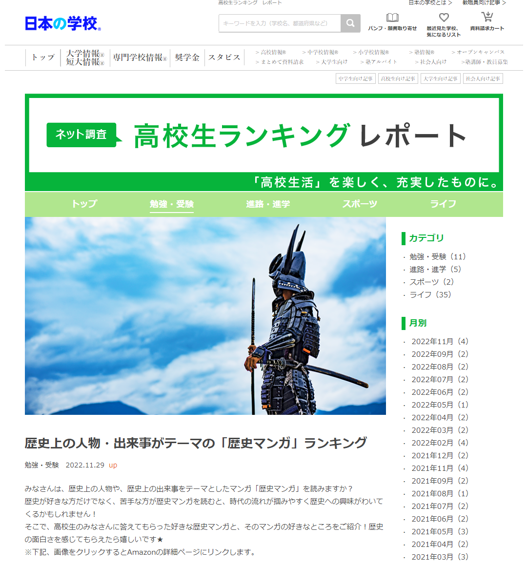高校生ランキングレポート「歴史上の人物・出来事がテーマの「歴史マンガ」ランキング」:https://school.js88.com/koukousei/life/55
