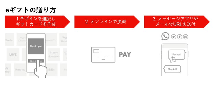 購入者は、発行されたeギフトにデジタルのメッセージカードを添えて、ご友人やご家族などにメールやSMS、Whatsappなどを介し、即時に贈ることができます。eギフトを受け取られた方は、店舗でご利用いただく場合、店頭に設置されたQRコードをお会計時にレジで読み取ることで決済が実行されます。公式オンラインストアでご利用いただく場合、eギフトに記載されたコードを決済時に入力いただくことでご利用いただけます。