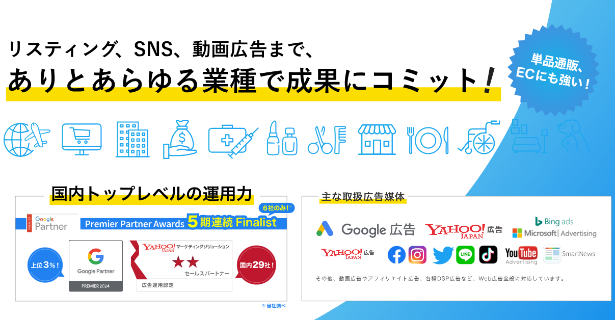 累計アカウント数2,120件、運用アカウント数495件の豊富なWeb広告運用実績と、GoogleやYahoo!に認められた確かな広告運用力があります。Googleが主催する「Premier Partner Awards」では、5期連続の国内ファイナリストに選出されており(※1)、Yahoo!のパートナー制度では、2つ星の代理店として認定を受けると同時に、国内で35社のみの広告運用認定パートナーとしても認定を受けています(※2)。