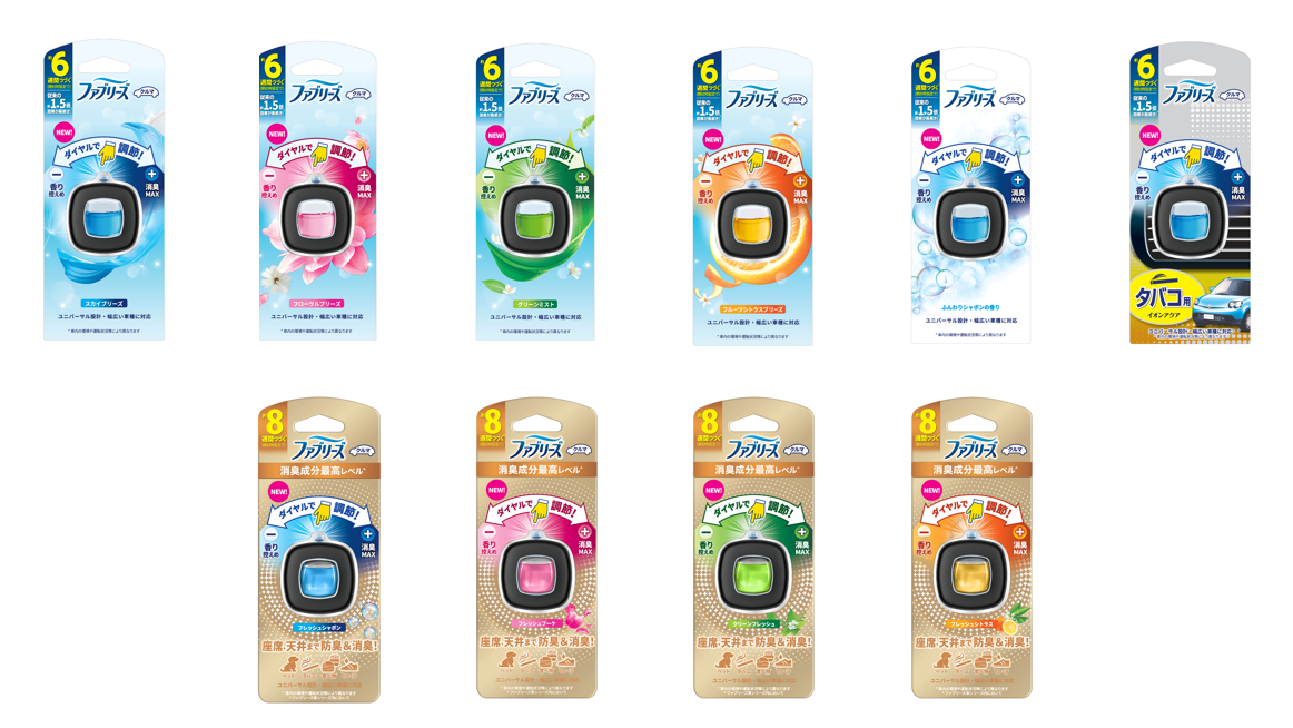 その中でも特に人気のベースシリーズと、消臭成分を最高レベル*で配合したシリーズを今回、12年ぶりに大幅改良。香り・消臭力を調節できる“新調節ダイヤル”を搭載し、好みに合わせて弱・中・強の3段階で調節が可能になったほか、有効成分の液体を増量し、効果の持続期間がこれまでよりも2週間ほど長続きするようになりました。また、エアコン送風口に取り付けるクリップの形状も改良し、これまで以上に幅広い車種に対応できる“ユニバーサルクリップ”としました。