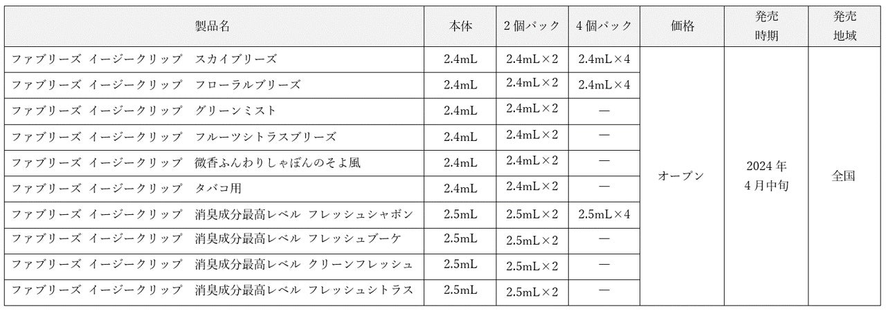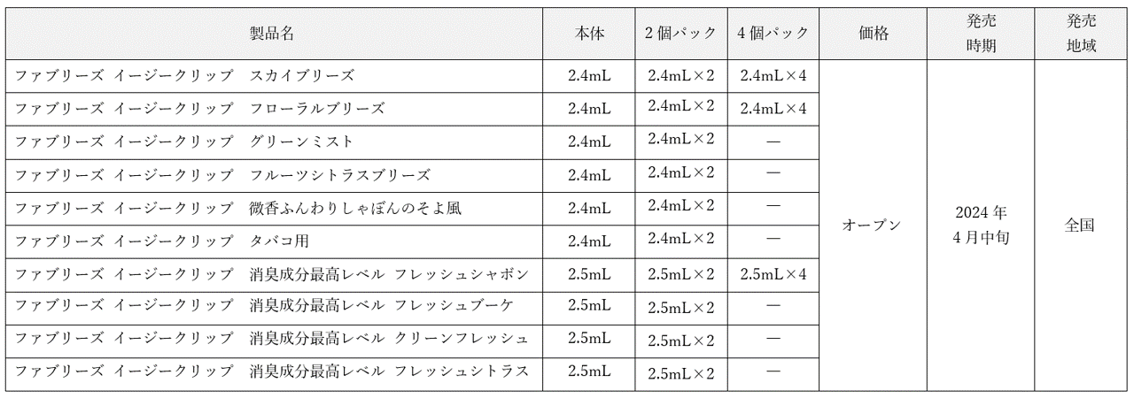 大幅改良により、これまで以上に満足度や使い勝手を向上させた「ファブリーズ イージークリップ」は、ベースシリーズより6種類の香り、消臭成分を最高レベル*で配合したシリーズより4種類の香り(全10製品)を発売いたします。