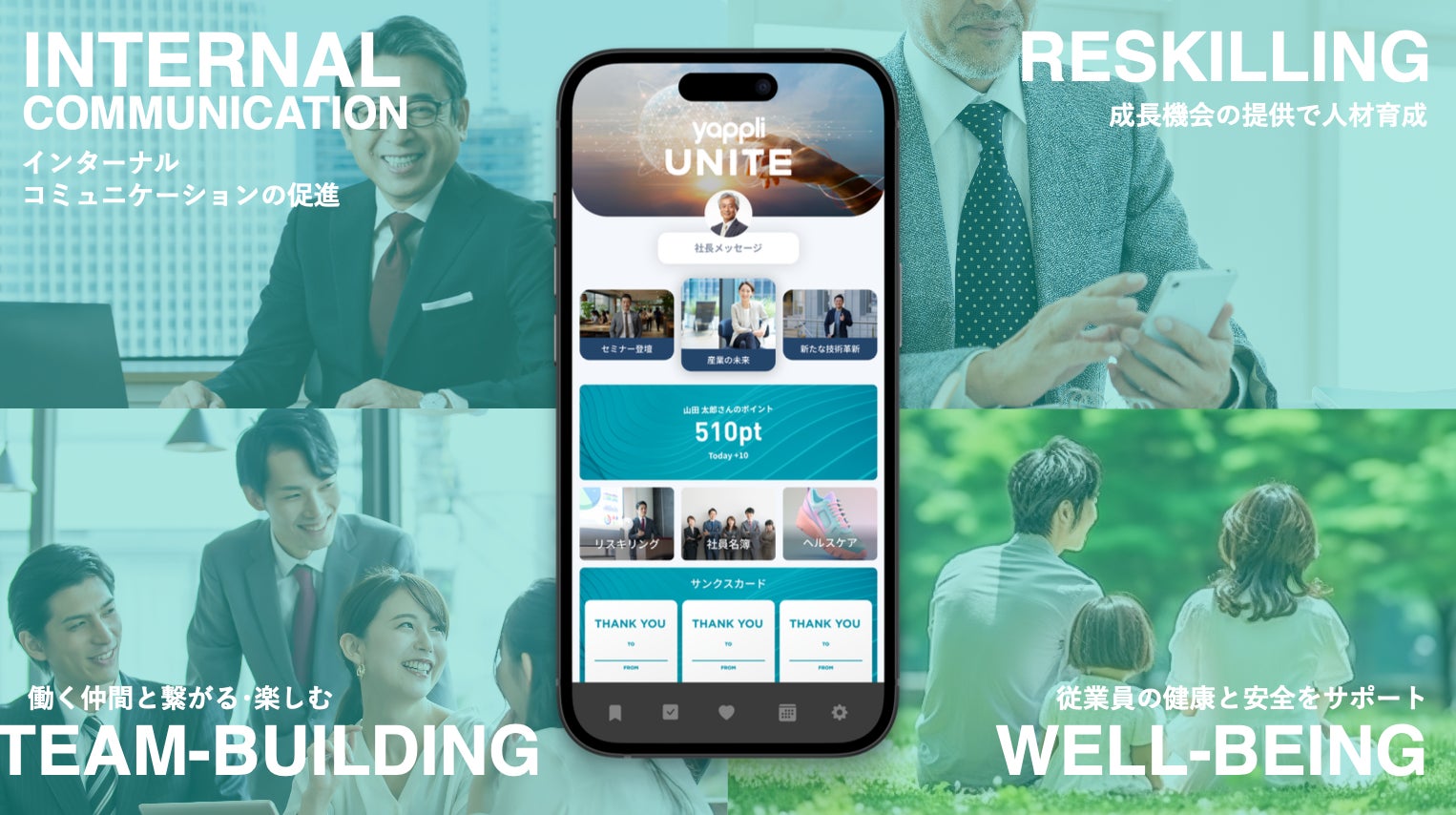 Yappli UNITEとは、2023年8月にスタートした従業員エンゲージメント向上サービスです。ノーコードで開発・運用・分析が可能なアプリプラットフォーム「Yappli」と「Yappli CRM」を組み合わせて構築する自社アプリを通じて、組織と従業員をより簡単・セキュアにつなげます。具体的には、社内施策をアプリ上で実行し、スマートフォン経由で従業員にダイレクトにアプローチすることで、エンゲージメントを向上させ、活気ある強固な組織作りをサポートします。