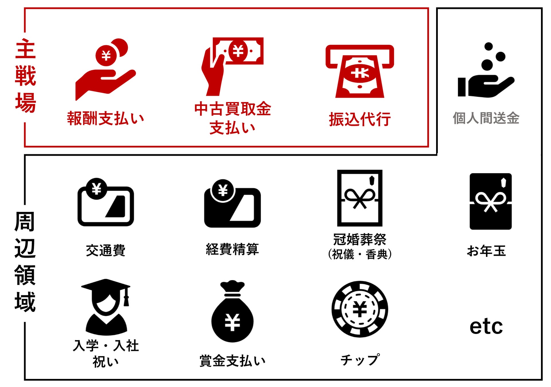 当初はトランザクションが少ない周辺領域からの先行導入により、基盤の強化と実績の積み上げを進め、主戦場となる報酬支払や中古品買取といった大規模な流通が見込まれる市場へ本格参入していきます。